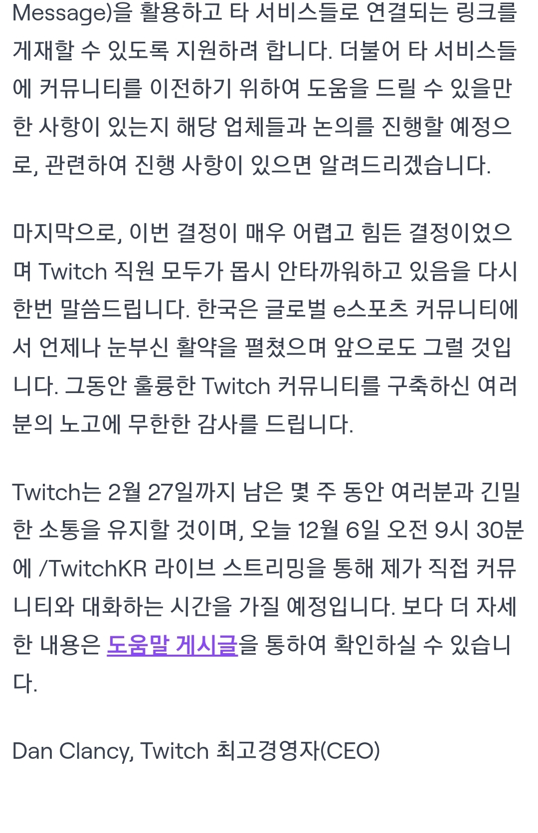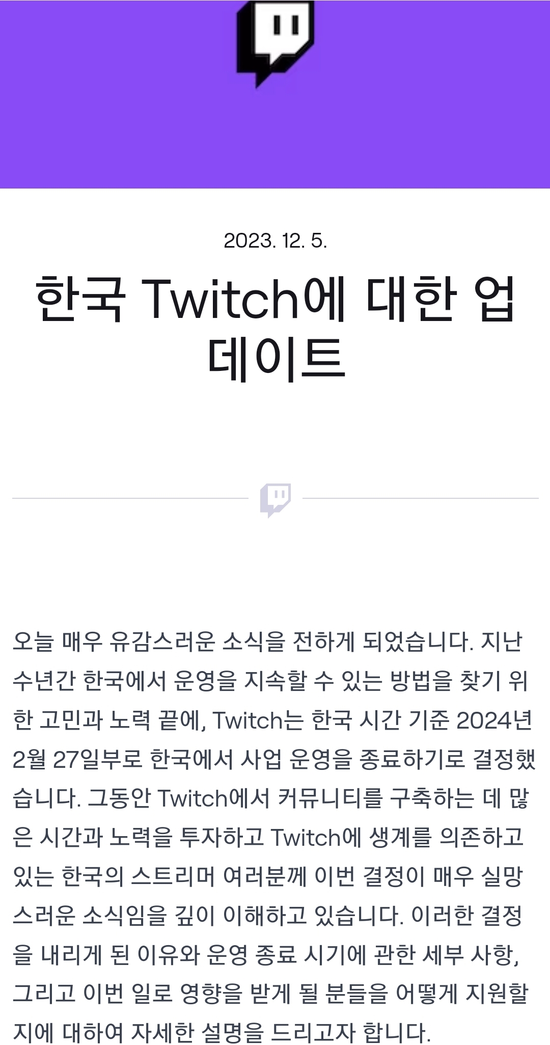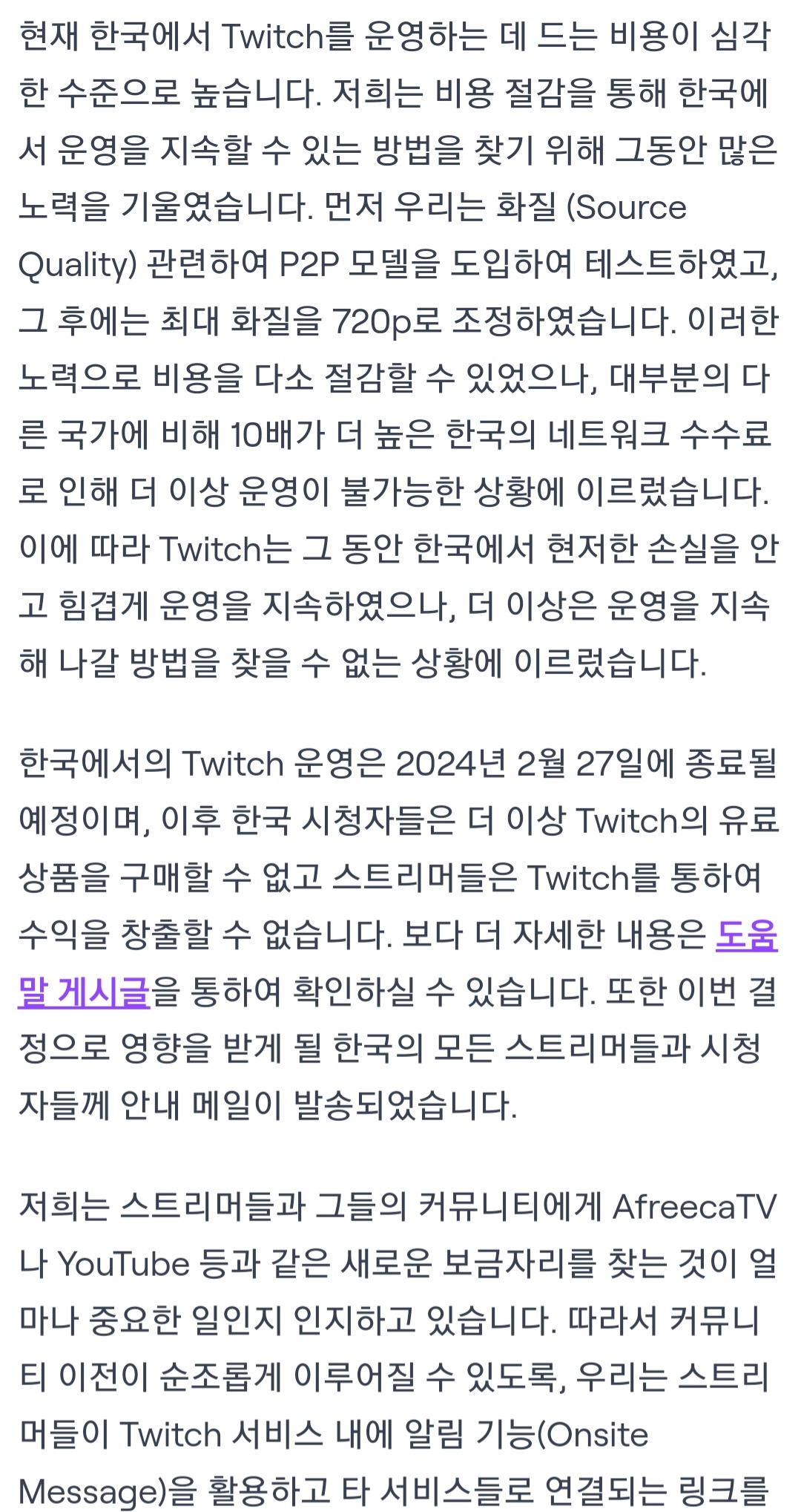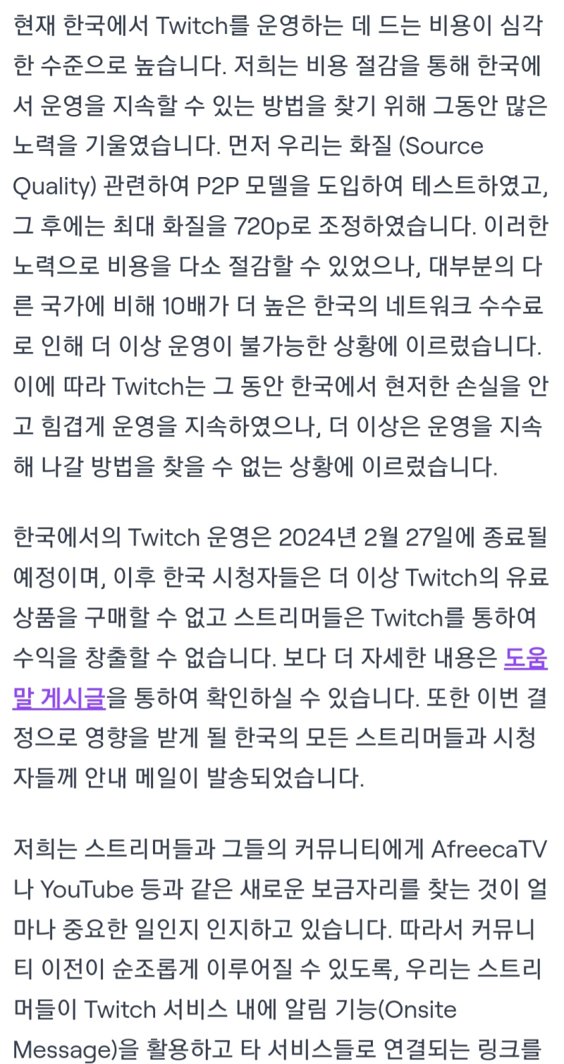 타카기 트위치 2024년 2월 27일 서비스 종료 [일반] 작성일시 : 2023. 12. 06 (12:34) 조회 : 1,856 / 댓글 : 18 아까, 이메일 보고 알았는데, 이게 무슨일인지...ㅠㅠ ※이게 사실이면, 수익장출한 사람들 어떻해...ㅠㅠ 출처(링크) : https://blog.twitch.tv/ko-kr/2023/12/05/an-update-on-twitch-in-korea/?%24web_only=true&_branch_match_id=1240664774196650484&utm_source=product&utm_campaign=magpie_mkt_krblog&utm_medium=persistentbanner&_branch_referrer=H4sIAAAAAAAAA8soKSkottLXLynPLEnO0C1P 7추천 글쓰기스크랩 신고