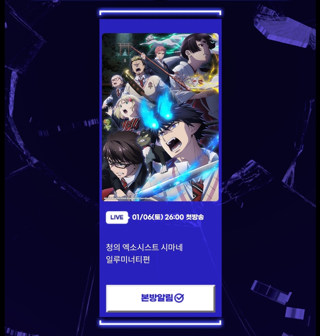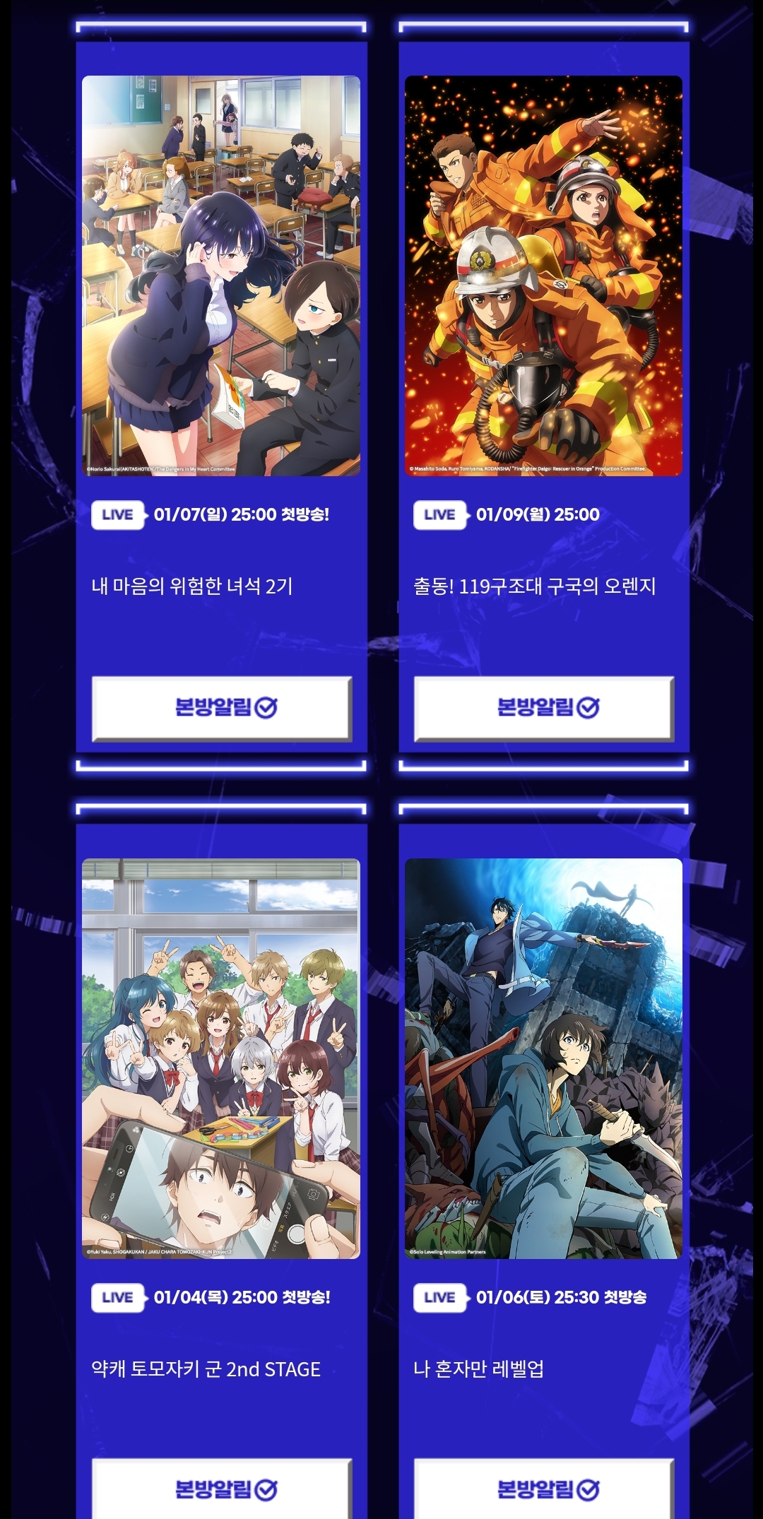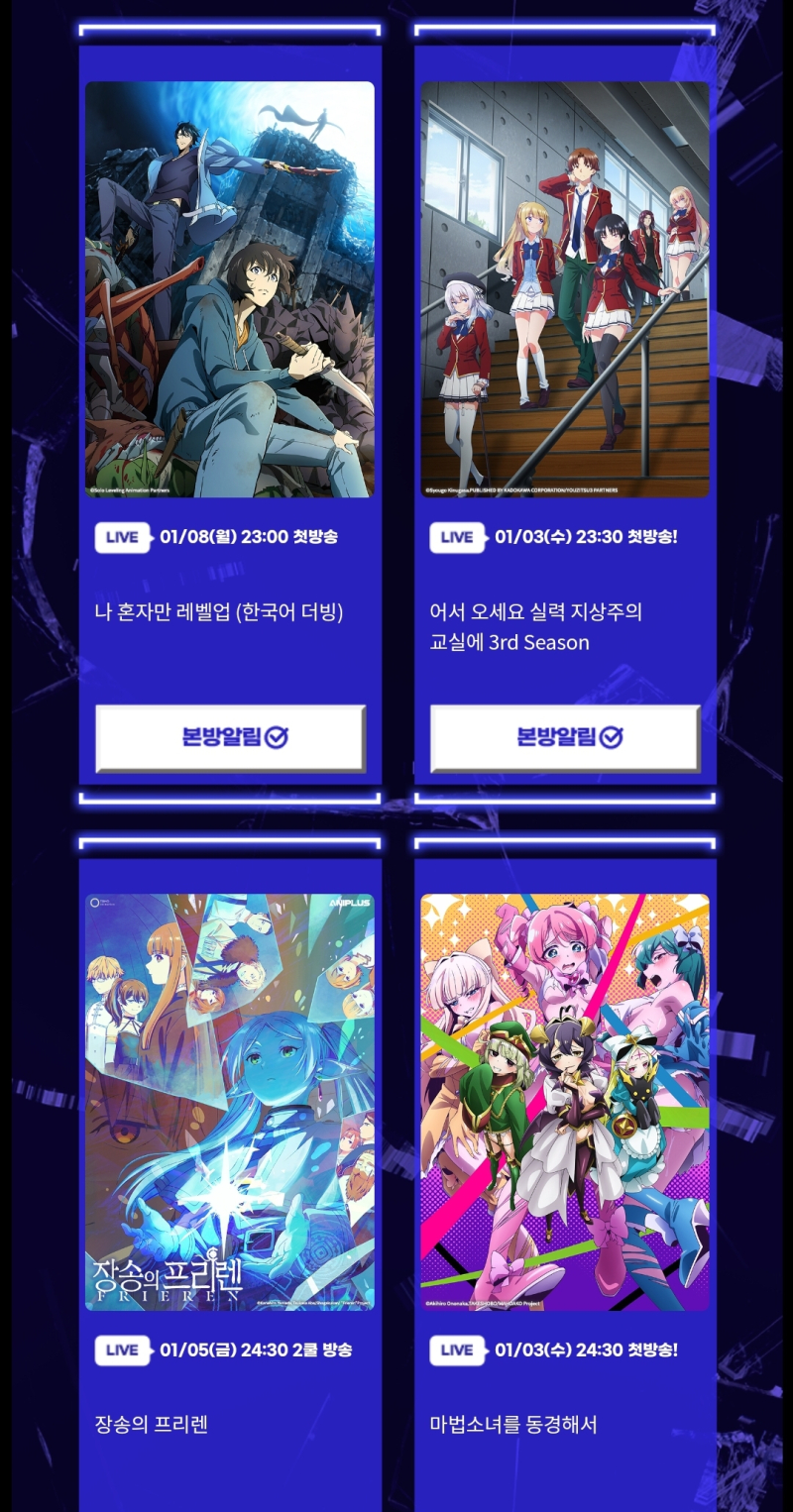 TMTonejae 2024년 1분기 신작 애니 라인업(애니플러스 1차) [애니] 작성일시 : 2023. 12. 27 (19:01) 조회 : 2,140 / 댓글 : 12 동명의 웹소설, 웹툰 원작으로 전세계에서 화제가 된나 혼자만 레벨업(자막, 더빙)달달한 럽코 내마위 2기 등 제가 재미있게 본 애니속편그리고 이전분기에서 판타지 GOAT인 장송의 프리렌 2쿨과특수구조대 소방대원의 이야기를 그린 구국의 오렌지 2쿨까지1차만 해도 든든합니다2,3차도 기대되네요 12추천 글쓰기스크랩 신고