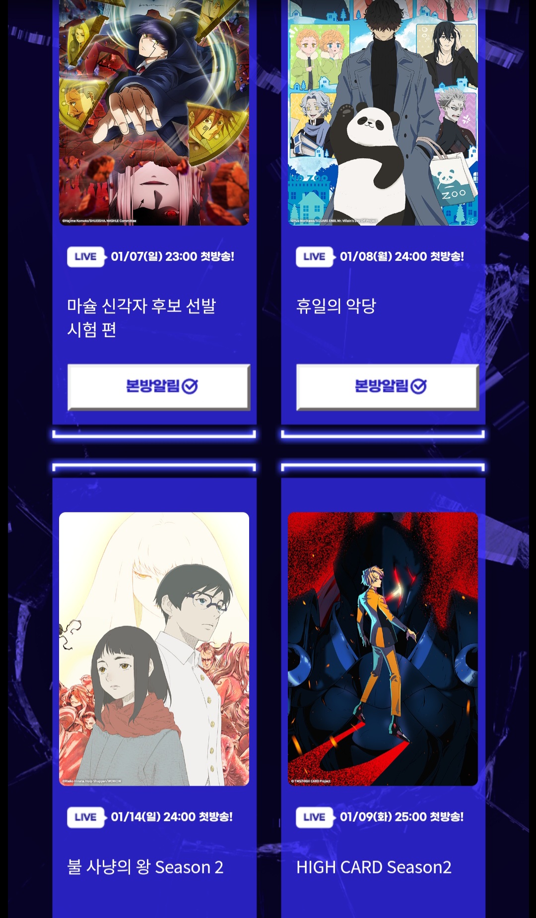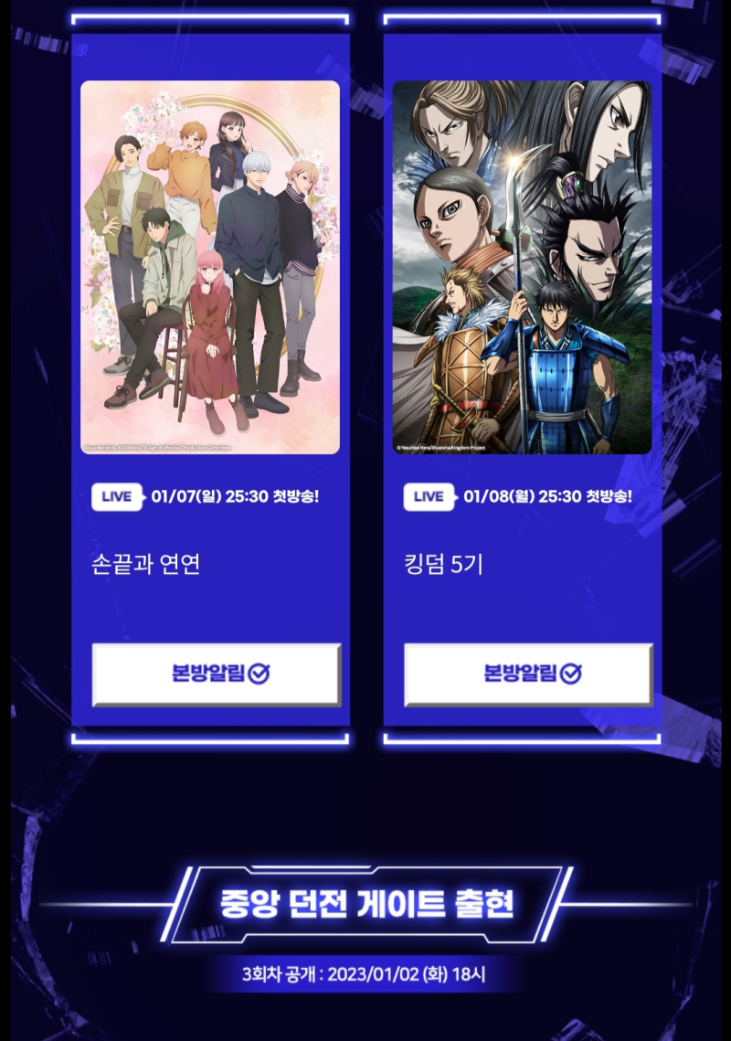 타카기 [애니플러스] 2024년 1분기 애니 2차 공개!! [애니] 작성일시 : 2023. 12. 29 (18:16) 조회 : 1,964 / 댓글 : 2 저중에 제가 볼 애니가 하나 있네요 다행이다.^^ 출처(링크) : https://www.aniplustv.com/event/326#newList 9추천 글쓰기스크랩 신고
