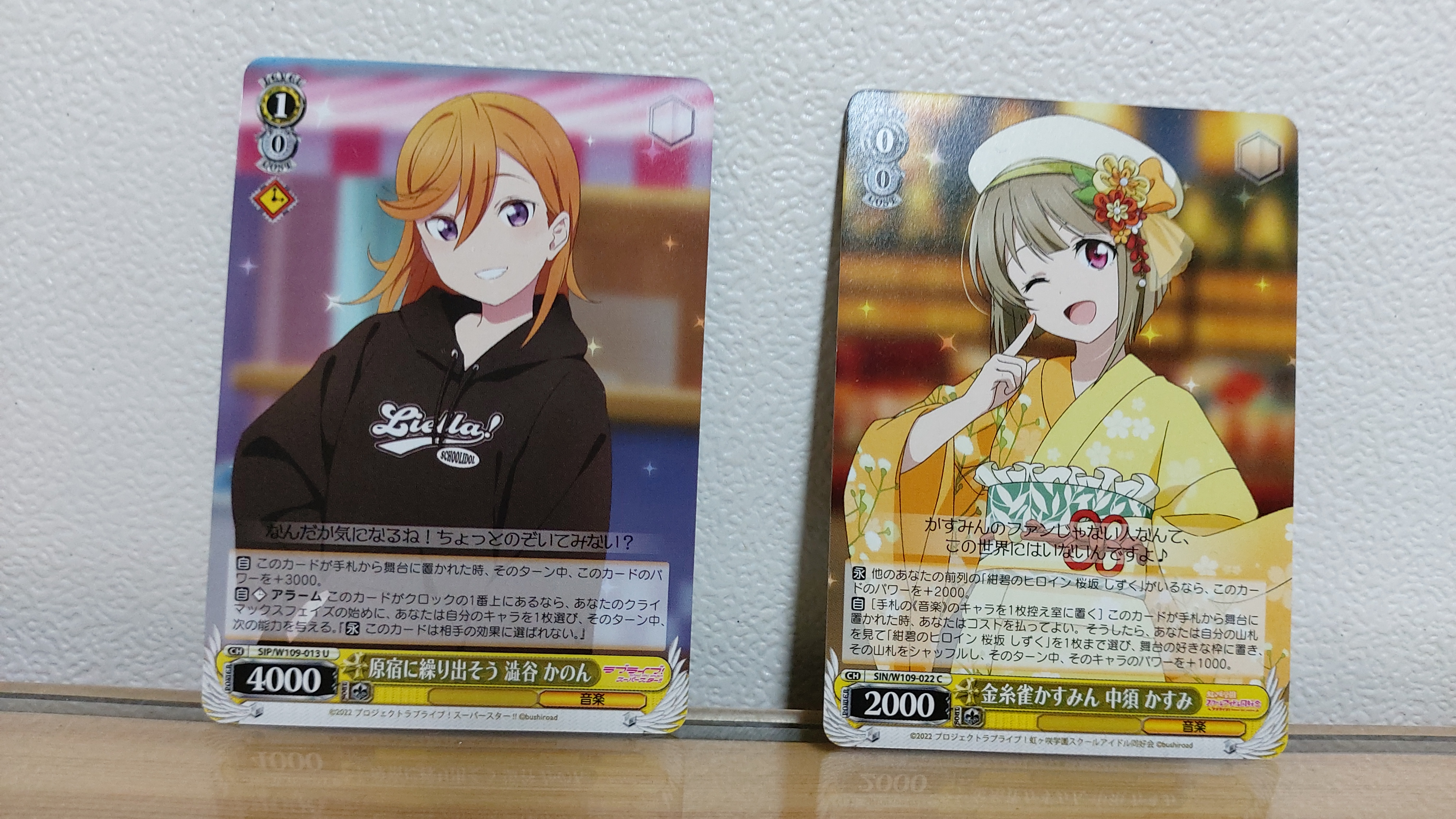 굿즈샵에서 받은 시부야 카논 카드와 나카스 카스미 카드