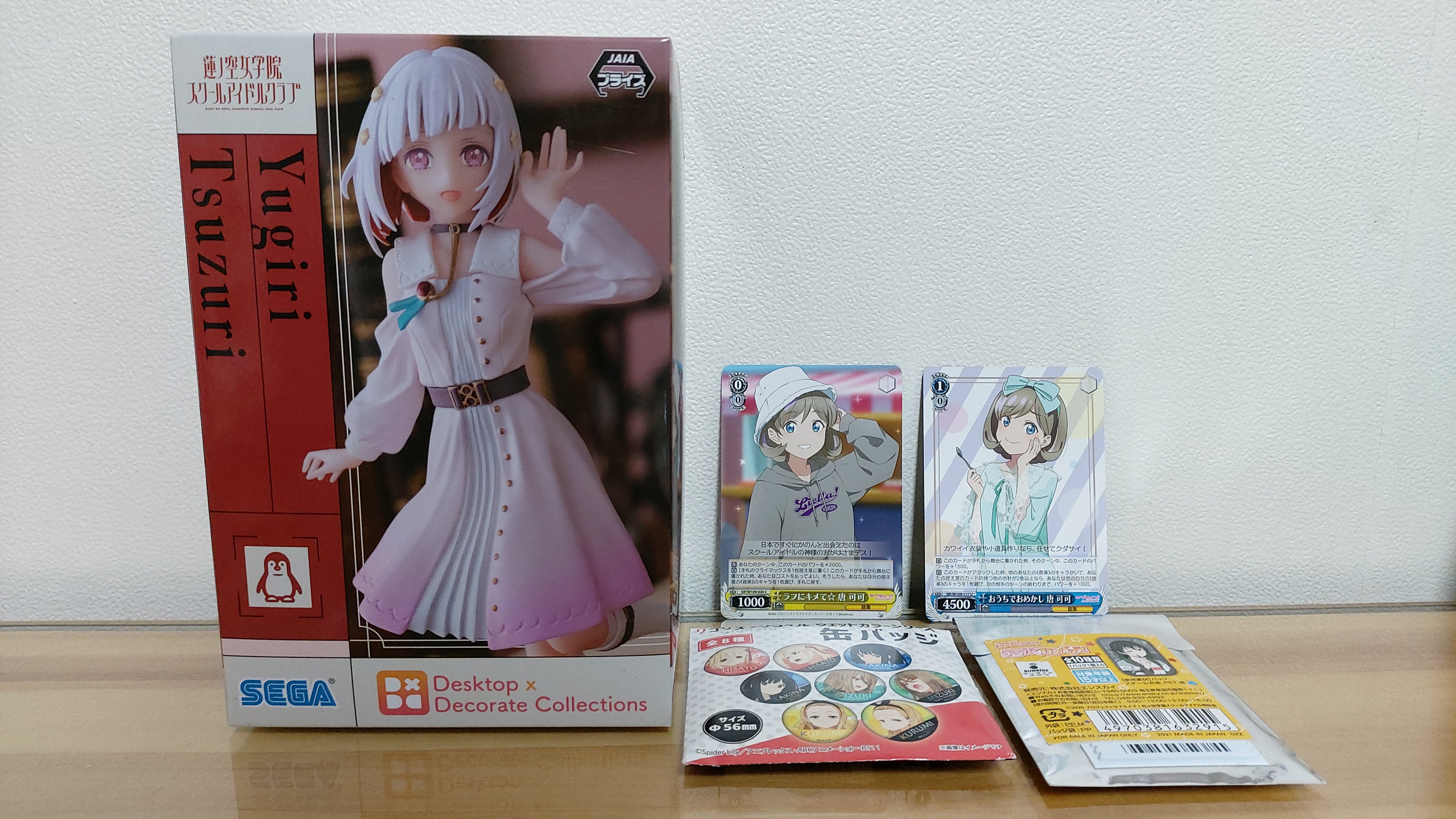 구입한 굿즈는 경품 피규어 1개와 캔뱃지 2개이며 러브라이브 슈퍼스타 탕쿠쿠 카드 2개는 받았는데요.