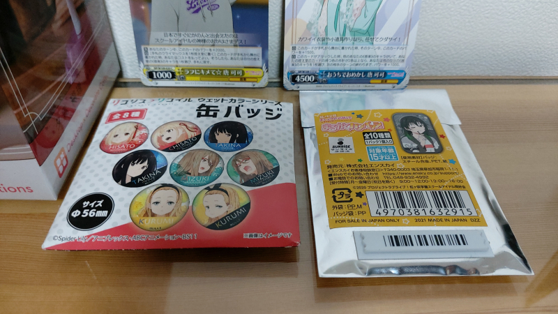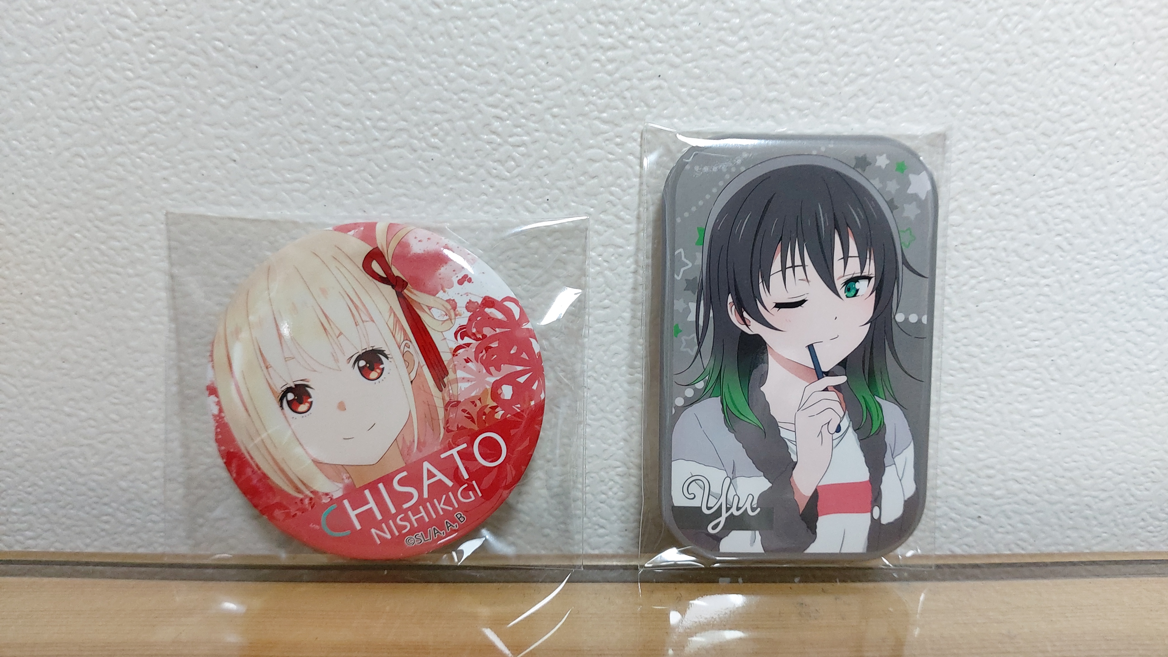 캔뱃지 2개는 하나는 리코리스 리코일 캔뱃지이고 다른 하나는 러브라이브 니지가사키 학원 스쿨 아이돌 동호회 캔뱃지인데 개봉해보니 치사토 캔뱃지가 나왔고 유우 캔뱃지가 나왔네요.