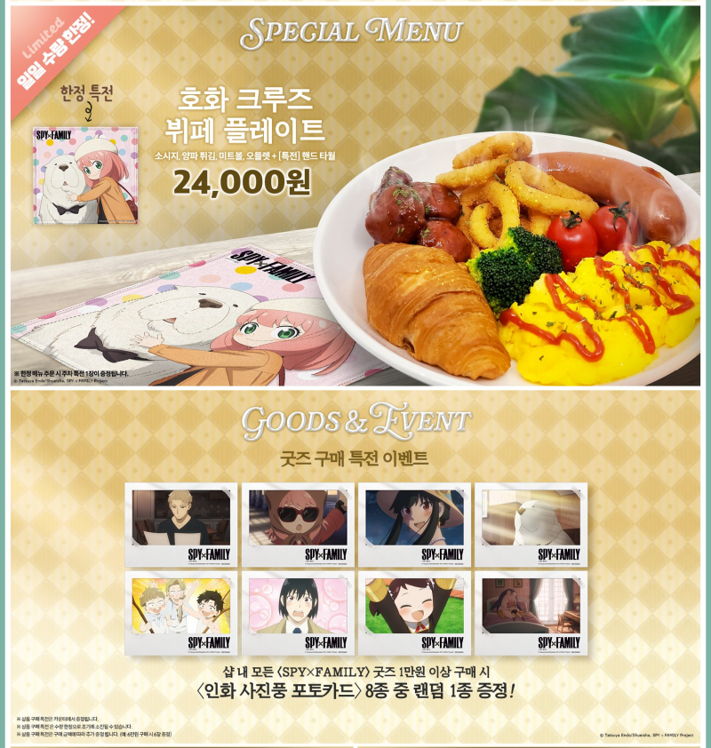 TMTonejae 스파이 패밀리 2기 X 애니플러스 샵 콜라보 카페 [일반] 작성일시 : 2024. 01. 03 (18:38) 조회 : 2,639 / 댓글 : 9 1월 11일부터 서울과 부산대전과 광주는 2월 8일부터스파패 2기 X 애니플러스샵 콜라보 카페 합니다재작년 12월 쯤에 1기 콜캎 가서요르 케익 먹고 쓰러지는 컨셉 샷 찍었는데이번엔 4화에서 아냐와 이든 칼리지 친구들이마카롱을 얻기 위해 도둑잡기 했는데그 마카롱도 나오네요일본 현지에서 찐으로 나왔는데한국도 나오네요 센스가 크으저도 생일 앞두고 가야겠습니다 ㅎㅎ 11추천 글쓰기스크랩 신고