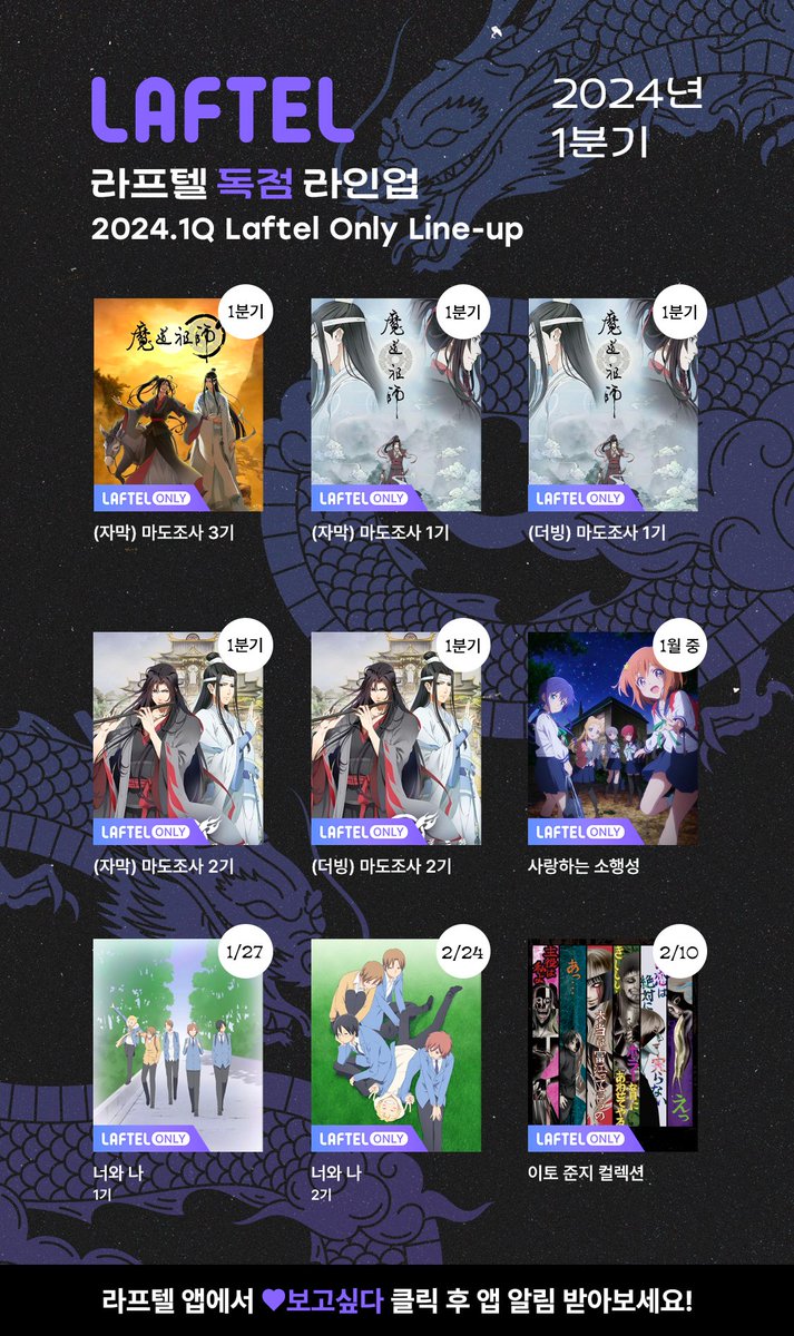 TMTonejae 2024년 1분기 라프텔 추가 방영 작품 공개 [애니] 작성일시 : 2024. 01. 03 (19:35) 조회 : 1,451 / 댓글 : 2 중국애니인데 상당한 팬덤이 있는 마도조사 시리즈1,2기에 이어 최신작 3기가 1분기 중에 공개합니다(한국어 더빙은 1, 2기만)2020년 동화공방 작품 사랑하는 소행성이번 달 중으로 공개합니다그리고 애니플러스에서 방영했다가판권 만료로 못 보던 너와나1기는 1월 27일 2기는 2월 24일 공개합니다그리고 공포 만화 장인 이토 준지 컬렉션은2월 10일에 공개합니다추가 작품은 모두 라프텔 독점 스트리밍 예정입니다!!! 4추천 글쓰기스크랩 신고