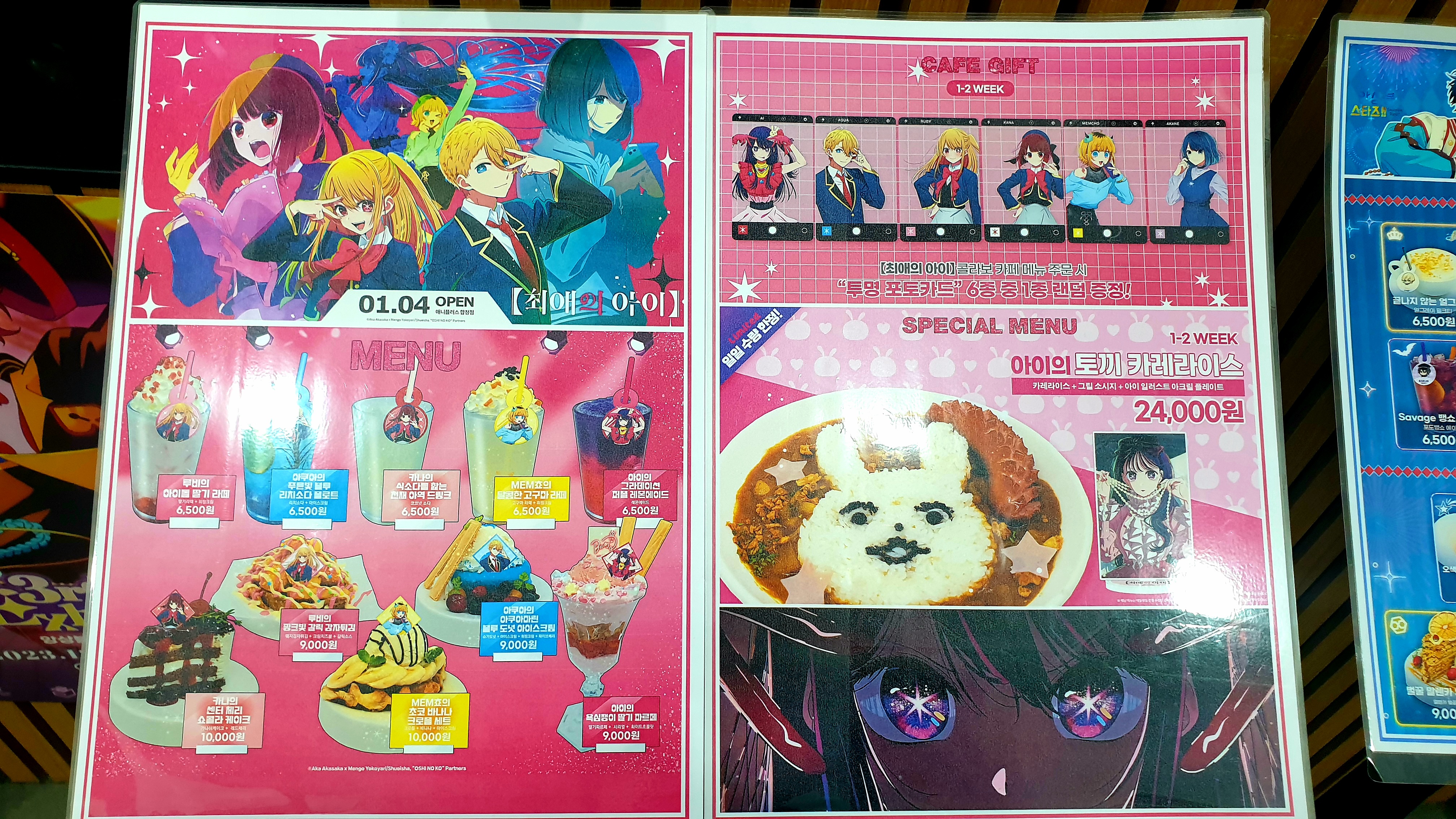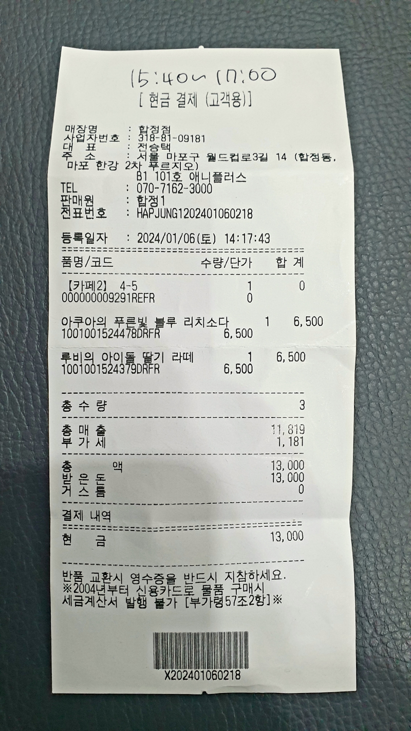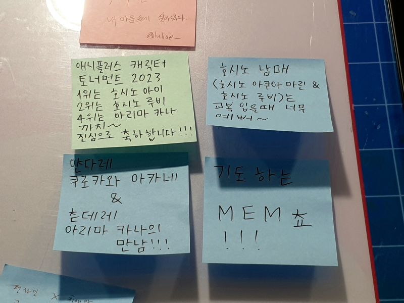 팜유재원이 애니플러스 서울합정점에가서 [최애의 아이] 콜라보 카페에 다녀왔구나~~ [일반] 작성일시 : 2024. 01. 06 (23:56) 조회 : 2,409 / 댓글 : 3 2024년 새해 첫 주말이 시작 되었구나~오늘은 소한 토요일 낮인데 서울 마포구 합정동이 너무 춥구나~드디어! 애니플러스 서울합정점에 가서 [최애의 아이] 콜라보 카페 열렸구나~ 먼저 [최애의 아이] 굿즈를 둘러보고~[최애의 아이] 콜라보 카페 예약하고~기다라고~ 기다리고~ 마침내 [최애의 아이] 콜라보 카페 입장!호시노 남매 (호시노 아쿠아마린 & 호시노 루비) 세트 합쳐서 13000원이란다~둘어보고 디저트 맛있게 먹고~다음엔 [최애의 아이 콜라보 카페] 2차로 가야겠다~ 12추천 글쓰기스크랩 신고