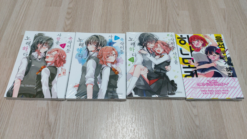 평범한송 백합 만화책들 도착! [코믹] 작성일시 : 2024. 02. 14 (21:59) 조회 : 1,333 / 댓글 : 3 오전에 알라딘에서 백합 만화책들을 구입했는데 퇴근후 집에 와보니 도착했습니다.속삭이듯 사랑을 노래하다 1, 2, 3권과 응석부리게 해줘, 히나모리 1권을 구입했는데요.만화책 제목 다르지만 공통점은 백합물이라서 샀네요. 4추천 글쓰기스크랩 신고