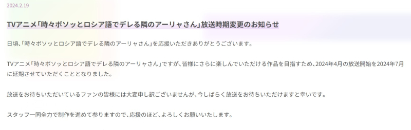 타카기 애니 "가끔씩 툭하고 러시아어로 부끄러워하는 옆자리의 아랴 양" 방송 연기 [애니] 작성일시 : 2024. 02. 19 (16:40) 조회 : 1,898 / 댓글 : 1 4월 예정에서 7월로 연기 아, 2분기 신작중에서 아랴 양 너무나 기대했었는데... ㅠㅠㅠㅠ 결국, 2분기 볼 애니 하나 줄어들었습니다.... ※이제, 블루 아카이브에 희망을 걸 수 밖에 없겠습니다... 출처(링크) : https://twitter.com/roshidere/status/1759457786797404439 4추천 글쓰기스크랩 신고