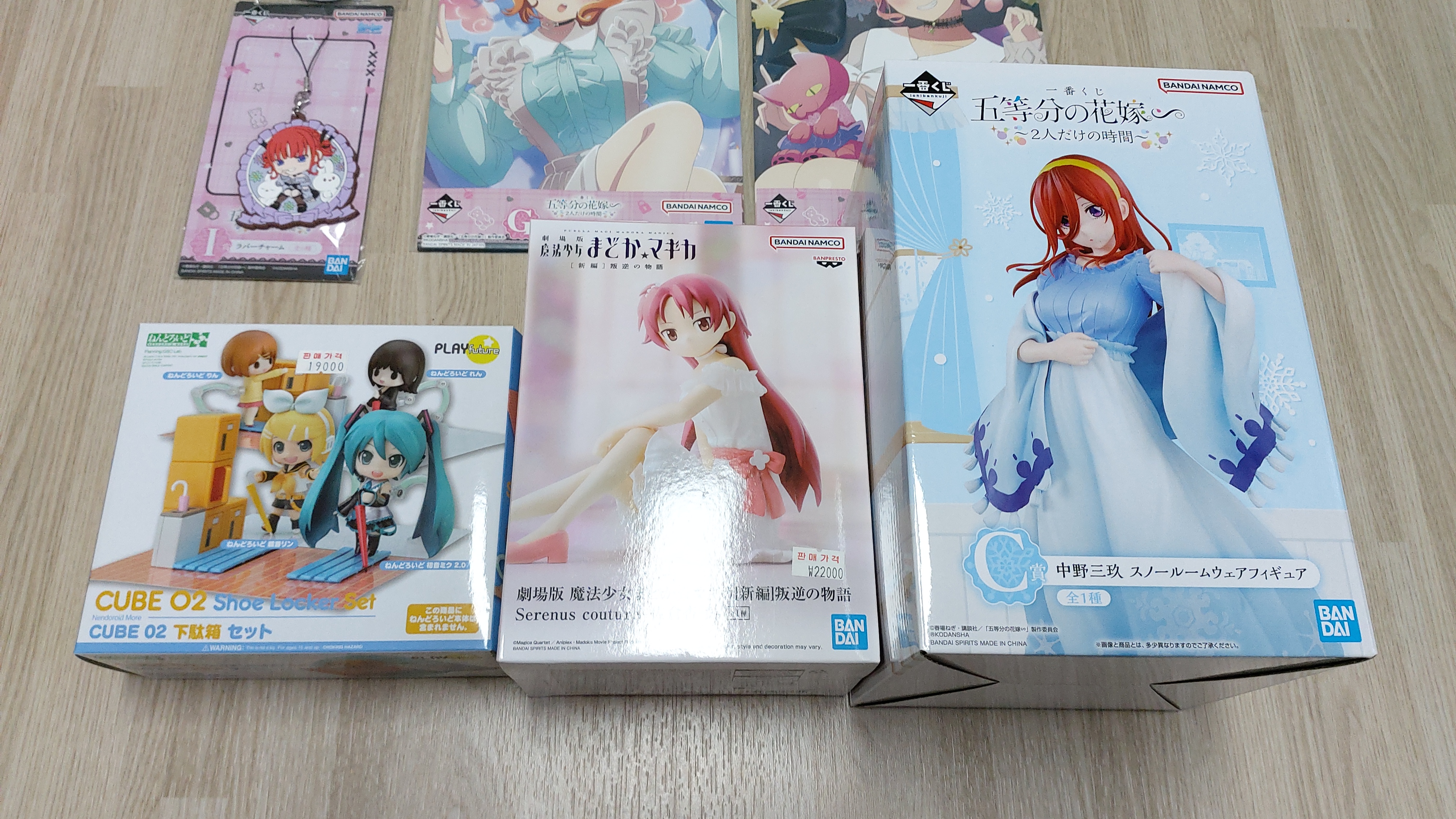 그 다음 경품 피규어는 마법소녀 마도카 마기카 사쿠라 쿄코 피규어이고 캔뱃지는 오등분의 신부 나카노 미쿠이며 같은 애니굿즈샵에서 샀고요.