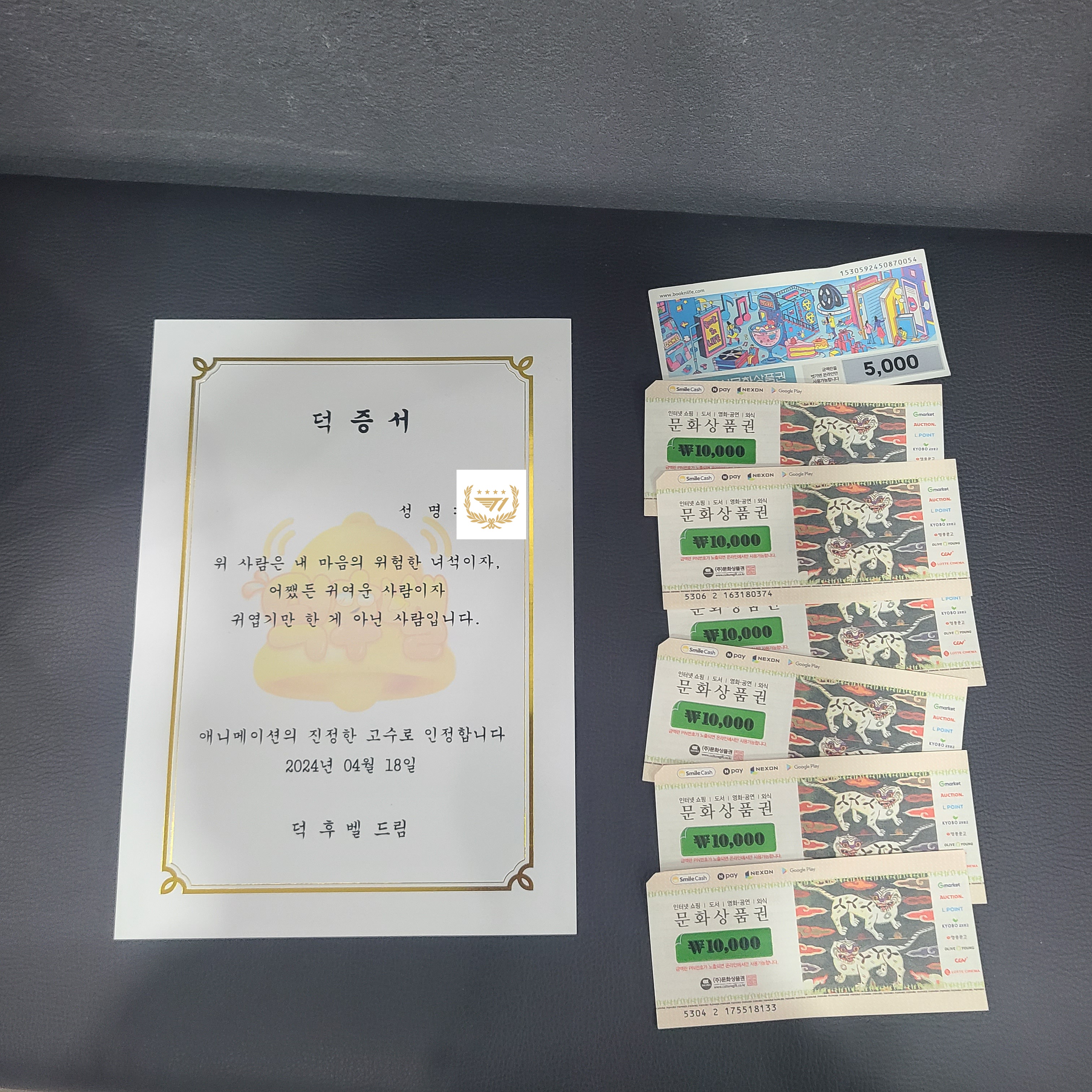 TMTonejae 오랜만에 애니플러스샵 갔다가 상품권 얻었습니다 [일반] 작성일시 : 2024. 04. 18 (13:27) 조회 : 1,702 / 댓글 : 10 오늘 오전 애니플러스 공식 SNS에서합정 애니플러스샵에서 덕후골든벨덕후벨 한다고 해서 출근 전에 갔는데요다양한 장르 중 하나를 택해서난이도별로 퀴즈의 정답을 맞추면최대 6만5천원 상당의 상품권을 준다고 하네요저는 아이돌로 해서뱅드림 관련 퀴즈를 했는데그 결과모든 단계를 클리어하여문화상품권 6만원 + 도서문화상품권 5천원득템했습니다!!참고로 상장 내용에서 애니플러스에서 방영한3가지 애니 제목이 숨겨져 있습니다 ㅎㅎ이걸로 영화보고 책 사야겠군요!!! 9추천 글쓰기스크랩 신고