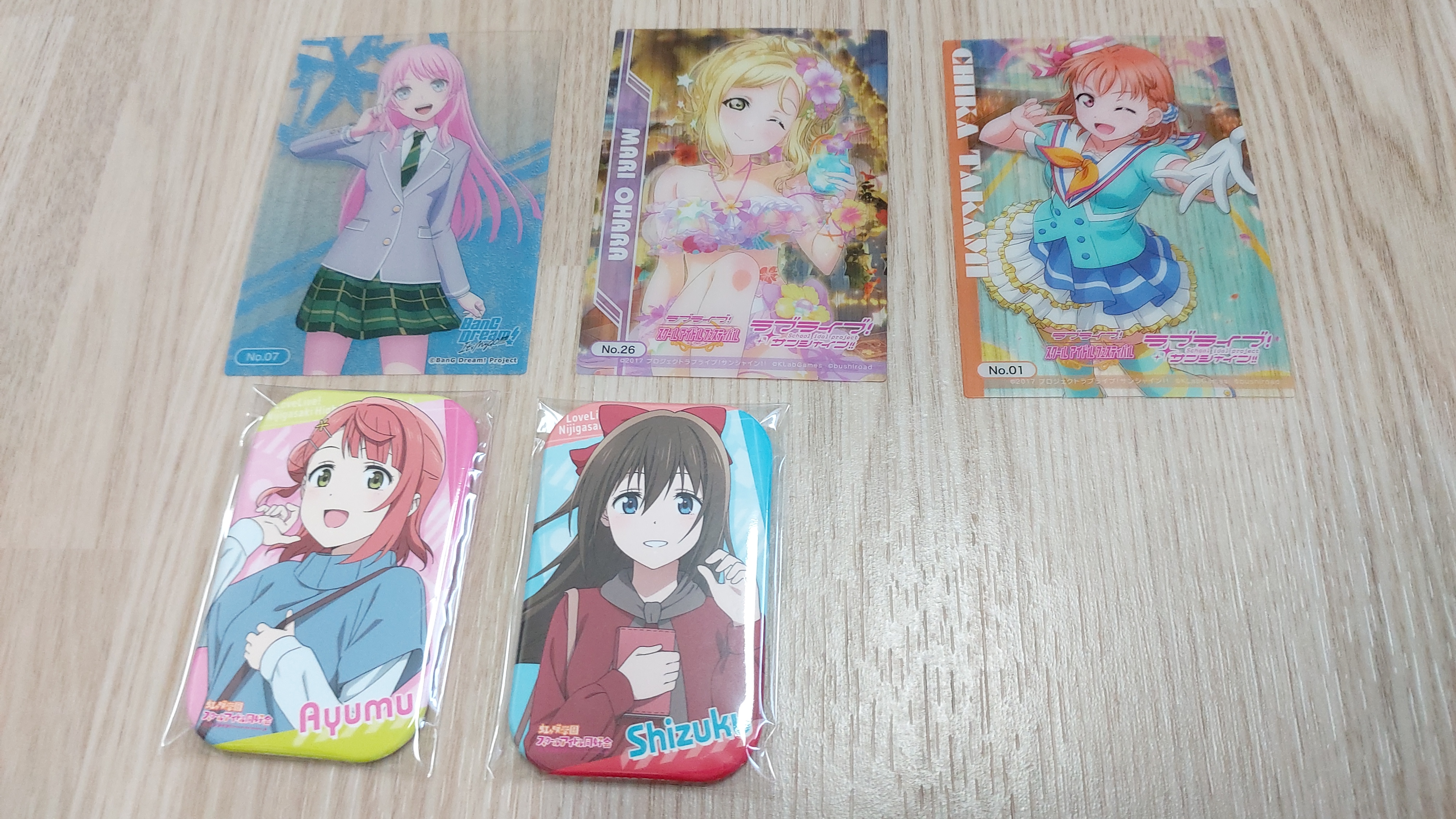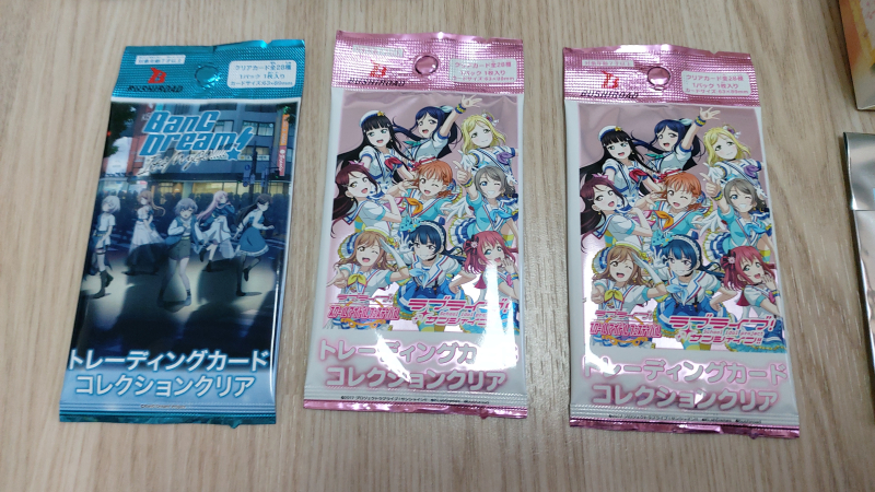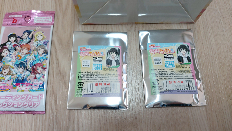 구입한 굿즈는 뱅드림 카드, 러브라이브 선샤인 카드, 러브라이브 니지가사키 학원 스쿨 아이돌 동호회 캔뱃지를 샀고 개봉했는데요.