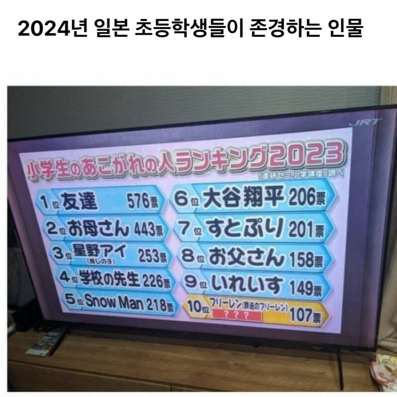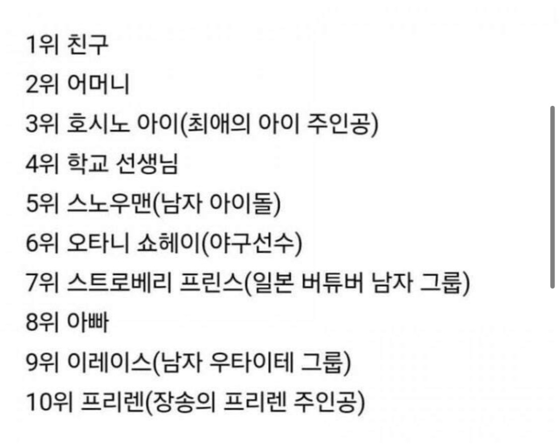 보라마키 요즘 초등학생들이 존경하는 인물들 [일반] 작성일시 : 2024. 06. 02 (11:40) 조회 : 2,204 / 댓글 : 6 작년 말 일본에서 초등학생들이 존경하는 인물들 중 가장 인기 많은 10명을 뽑았는데호시노 아이, 스토푸리, 이레이스, 프리렌 등 서브컬쳐계 캐릭터나 가상의 인물들이 순위권을 차지했다는군요오타니나 스노우맨은 그렇다치고 서브컬쳐 캐릭터들이 존경받는 사회라니 뭔가 대단하네요그와중에 엄빠대전은 일본에서도 엄마 승 8추천 글쓰기스크랩 신고