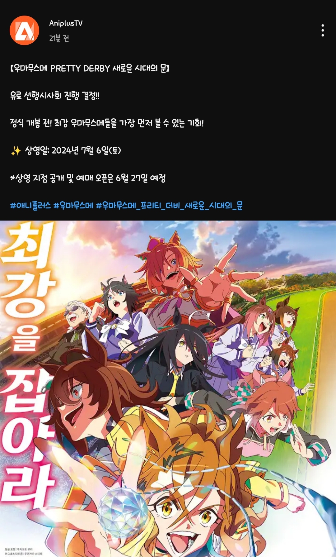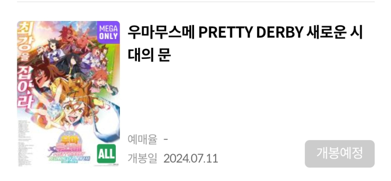 TMTonejae 우마무스메 새로운 시대의 문 국내 개봉일 공개 [애니] 작성일시 : 2024. 06. 26 (20:22) 조회 : 2,217 / 댓글 : 7 메가박스 앱에 들어가니개봉일이 오는 7월 11일로 떴네요메박 단독 개봉 확정입니다이로써 명탐정코난과 슈퍼배드보다 먼저개봉합니다그리고 개봉 전 오는 7월 6일 토요일에유료 시사회가 진행됩니다상영 지점 공개와 예매 오픈은내일 6월 27일에 진행될 예정이라고 하네요저는 유료 선상회로 볼 것 같네요 ㅎㅎ 8추천 글쓰기스크랩 신고