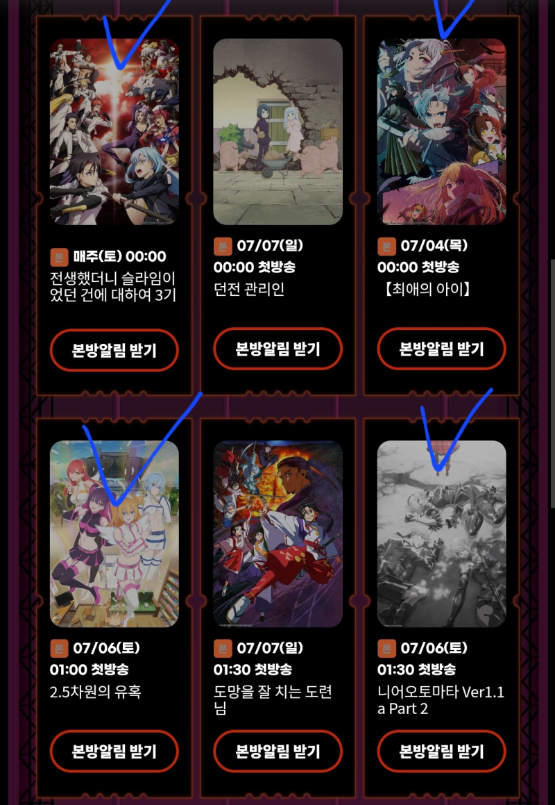 TMTonejae 2024년 3분기 볼 애니 [애니] 작성일시 : 2024. 06. 28 (20:11) 조회 : 1,872 / 댓글 : 9 볼 거 다 적으면 길기 때문에기대작 위주로 고릅니다먼저 애니플러스는2.5차원의 유혹, 니어오토마타 Part 2최애의 아이 2기, 이세계 수어사이드 스쿼드볼 예정입니다전생슬 3기와 늑향은 2분기에 이어 방영한 거라계속 볼 예정오늘 3분기 라프텔 독점작 나왔는데물드는 세계의 내일로부터스즈미야 하루히의 우울미래일기(그 레전드 짤 맞습니다 ㅋㅋㅋ)비시소 1, 2기요렇게 볼 것 같아요 10추천 글쓰기스크랩 신고