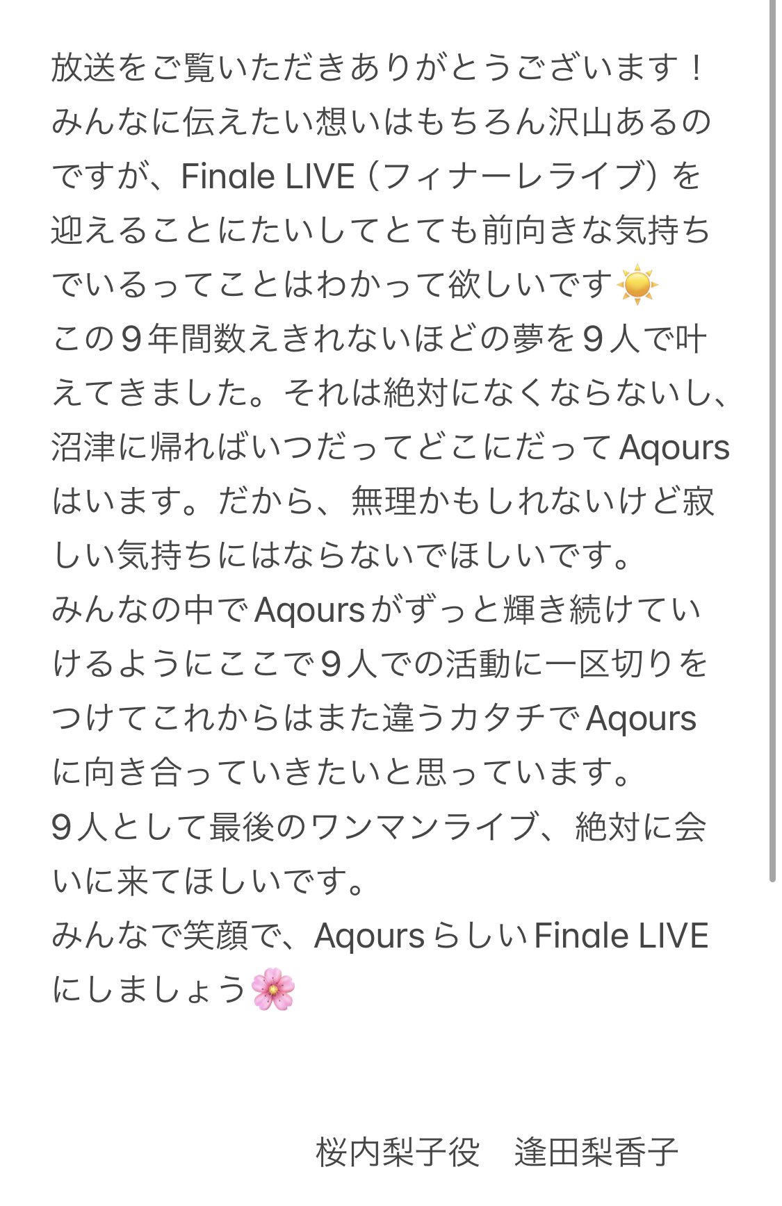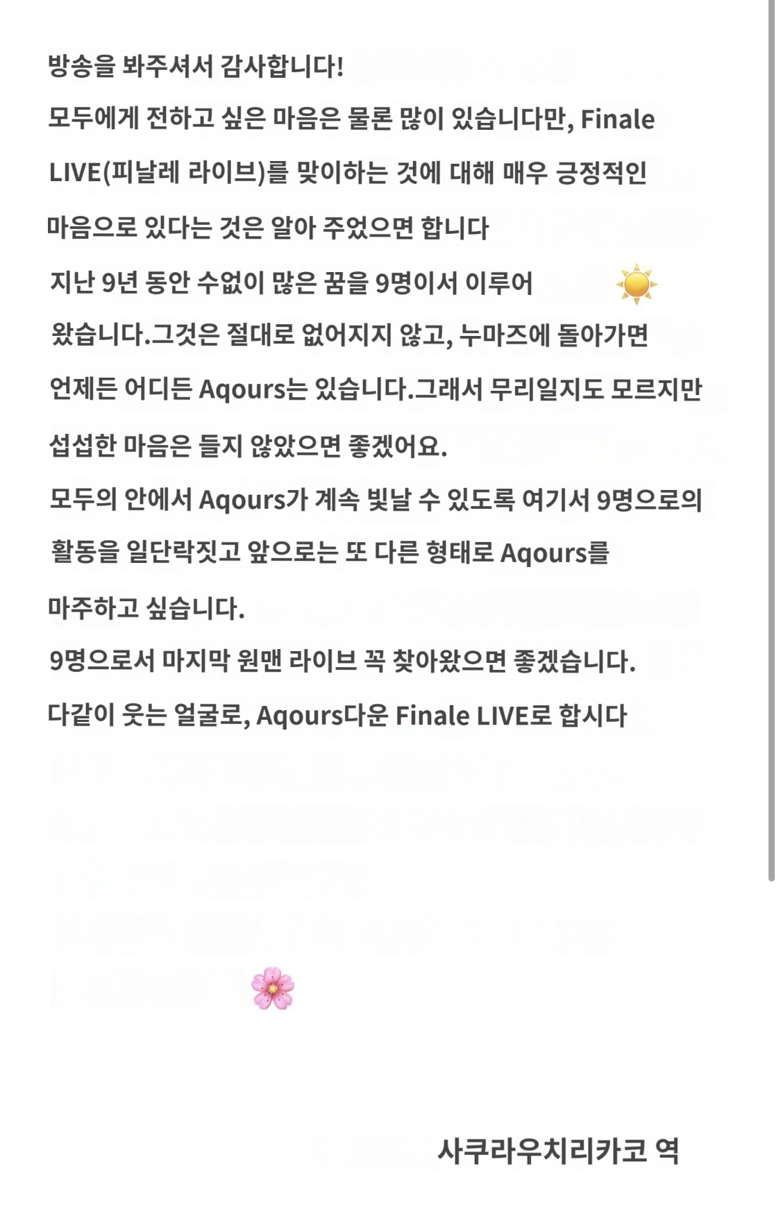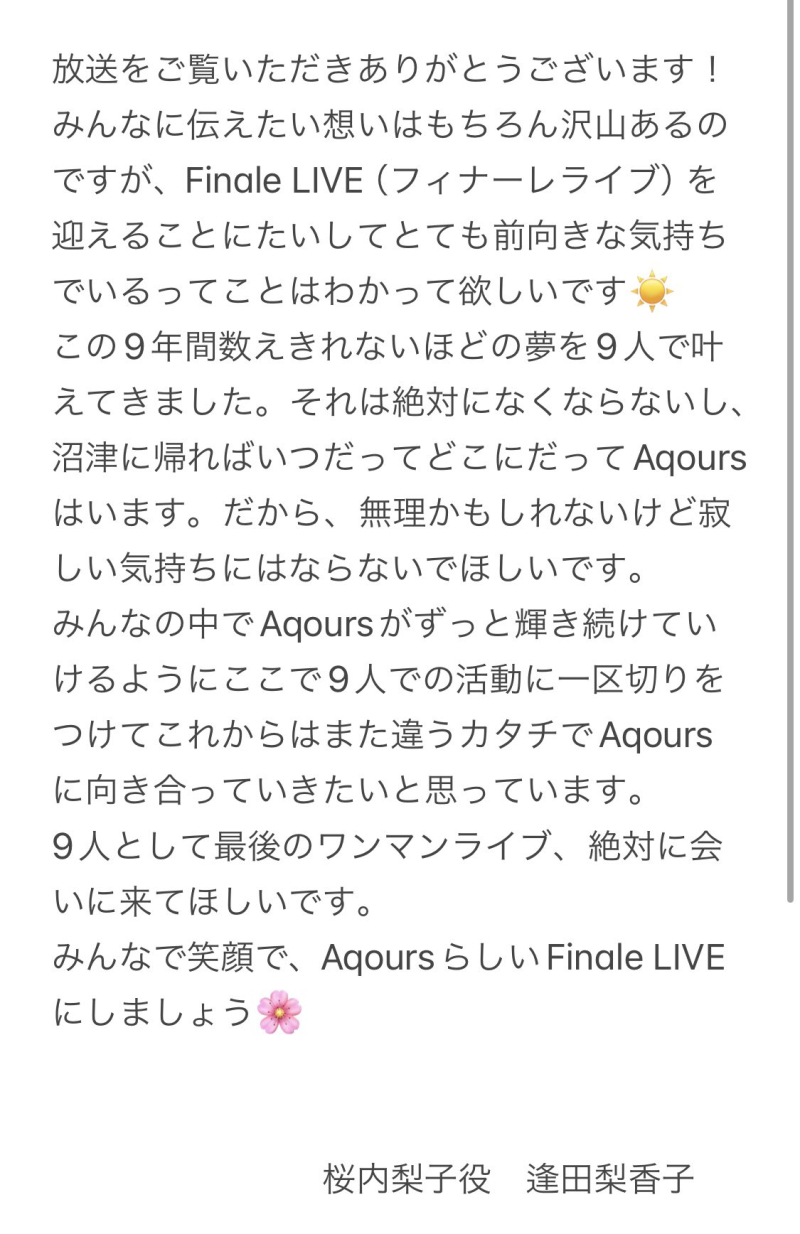 안달뷩 뒤늦게 Aqours 9주년 특집 대한 슬픔소식...😭😭💕💕 [일반] 작성일시 : 2024. 07. 01 (20:35) 조회 : 1,583 / 댓글 : 8 하아...물론 9주년 특집 이라서 좋은 소식도 많이 있지만 벌써 부터 Aqours도 μ’s처럼 파이널 라이브 무대 준비 예정 입니다...그나마 다행이 공식으로 완전히 끝나는 의미는 아니지만 단독 라이브 콘서트 공연은 끝나고 말았어요...그 동안 많이 웃고 즐기고 재미있었는데 마지막 단독 콘서트 이라서 많이 아쉽네요...!!😭😭💕💕👍👍 (영상링크)https://x.com/LoveLive_staff/status/1807372644251222212?t=E_w-UDm8I8xaVLwNcZTPYQ&s=19 출처(링크) : https://x.com/Rikako_Aida/status/1807379937177059628?t=1OgTj-SJPBjOm27yivQG_w&s=19 5추천 글쓰기스크랩 신고