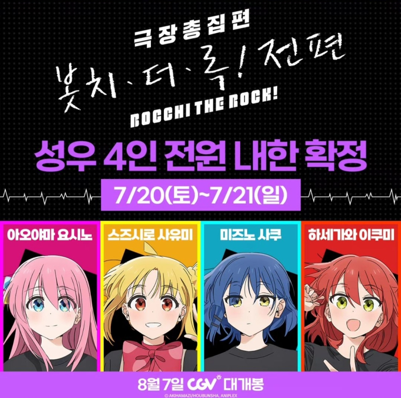 TMTonejae 결속밴드 성우가 한국에 오네요 [일반] 작성일시 : 2024. 07. 05 (12:53) 조회 : 1,809 / 댓글 : 11 오는 8월 7일 극장총집편 전편이 개봉하는데홍보차로 온다고 하네요오는 7월 20일과 21일 주말 양일간 진행되고구체적인 일정과 티켓팅인지 추첨인지는추후에 나온다고 합니다저는 이 날 해외 출장으로 못 가서 아쉽네요 ㅠㅠ 13추천 글쓰기스크랩 신고