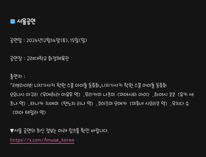TMTonejae 러브라이브 시리즈 아시아투어 2024 한국 공연 확정 [일반] 작성일시 : 2024. 07. 05 (12:56) 조회 : 1,848 / 댓글 : 9 뮤즈, 아쿠아, 니지동, 리엘라 등러브라이브 시리즈 그룹들이 아시아 각국을 돌며투어하는데한국도 개최한다고 합니다한국은 니지동 팀이 옵니다오는 12월 14일, 15일서울 성북구 고려대학교 화정체육관에서아구퐁 등 니지동 6명 성우가 온다고 합니다지난 2019년 아쿠아 아시아 투어 이후무려 5년만에 러브라이브 공연이라고 하네요AGF 대신 가야할 것 같...ㅋㅋㅋㅋㅋ 8추천 글쓰기스크랩 신고