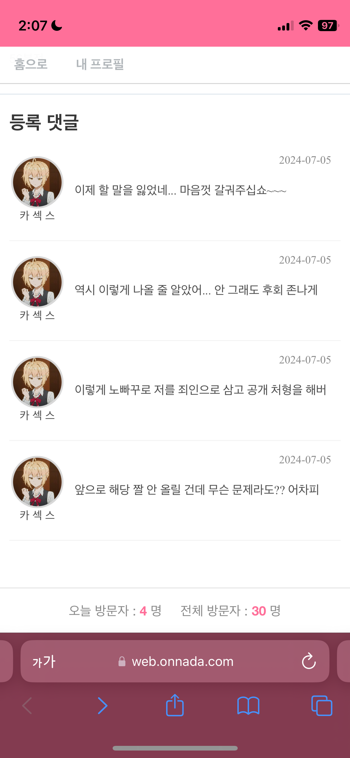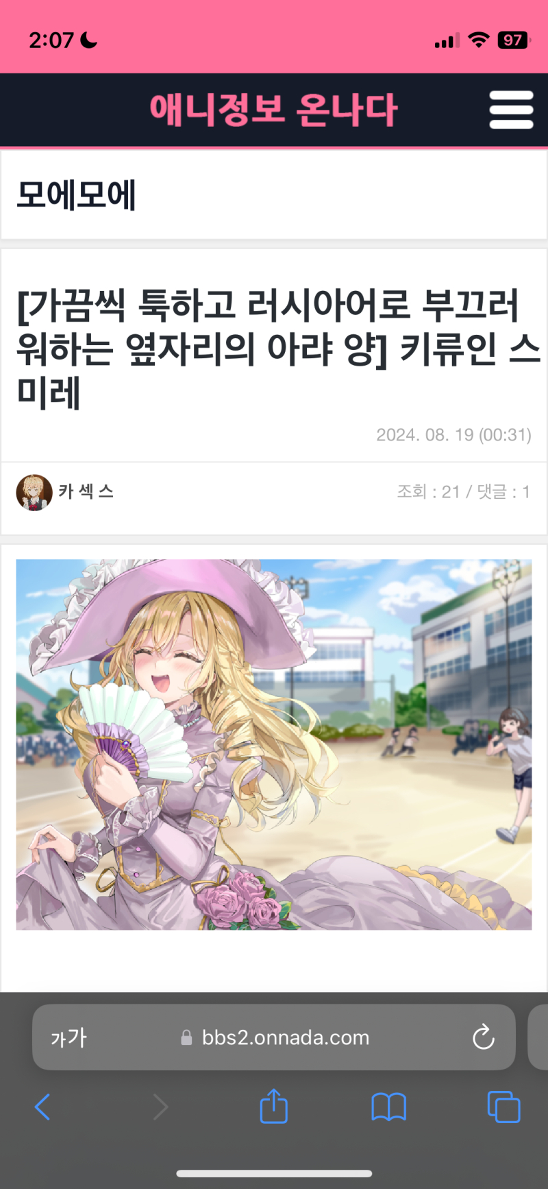 보라마키 불건전한 닉네임은 자제합시다 [일반] 작성일시 : 2024. 08. 19 (05:20) 조회 : 1,914 / 댓글 : 4 갑자기 일러스트 여러가지 올라오길래 들어가봤는데 왠 이상한 닉네임이 있어서 보니까 예스로 이름만 바꿔서 돌아온 선님이더라고요...선님 많이 반성하고 있는 건 저도 많이 알겠지만 닉네임은 건전한 걸로 짓도록 합시다. 8추천 글쓰기스크랩 신고