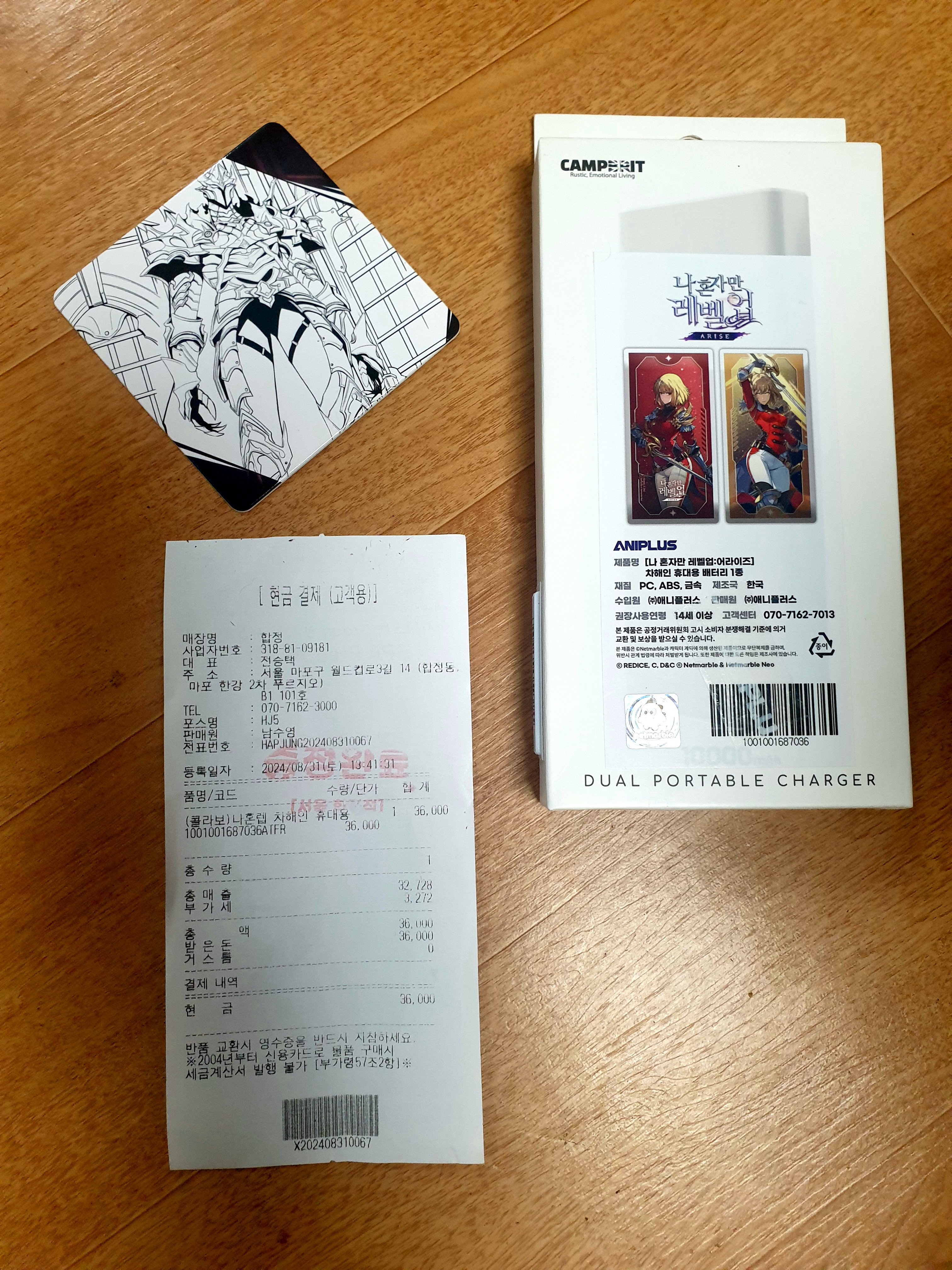 애니플러스 오프라인 매장에서 <나 혼자만 레벨업 : 어라이즈> 굿즈 30000원 이상 구매시 "사각 코스터" 6개 중 1개 받았다~