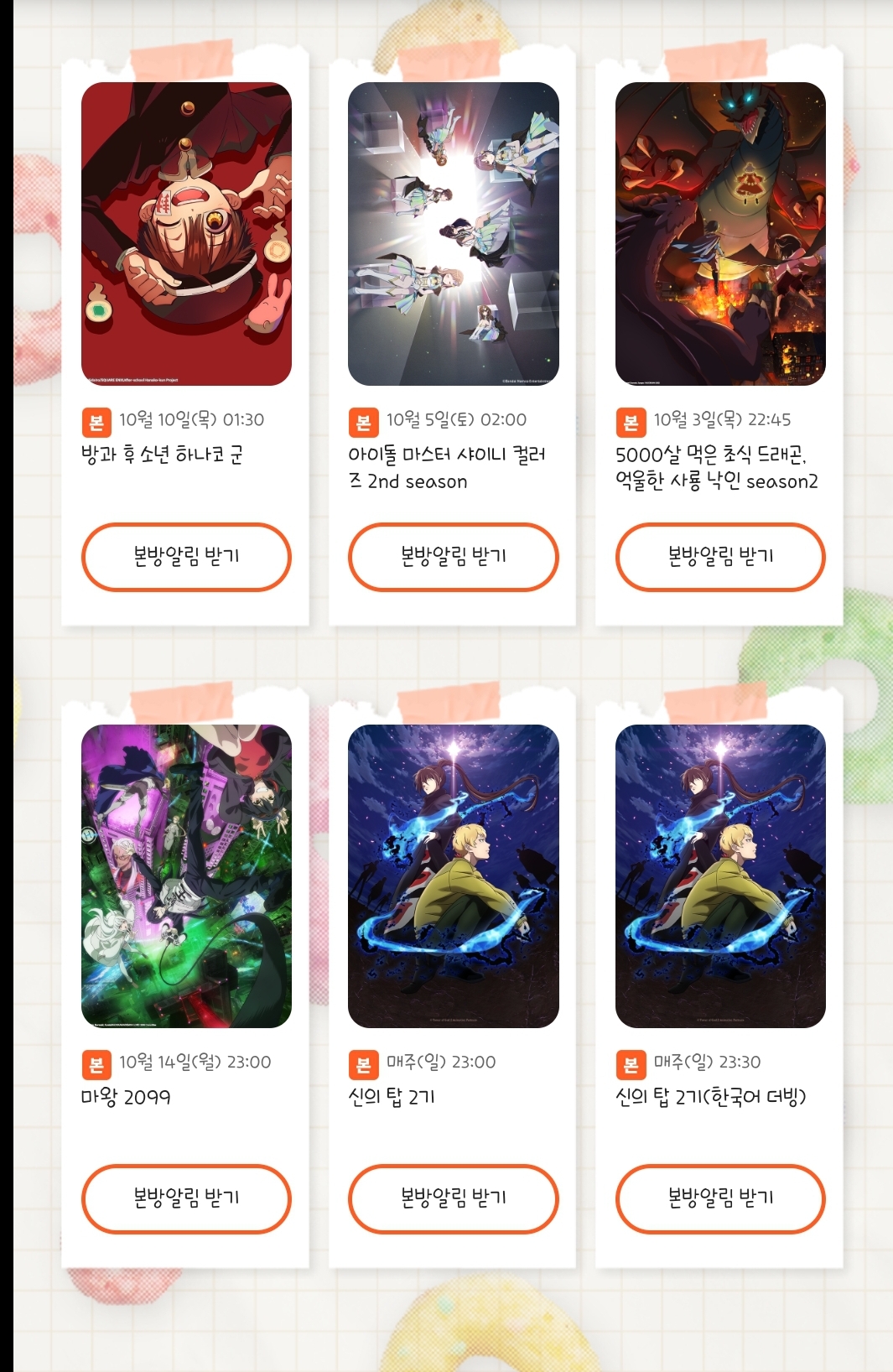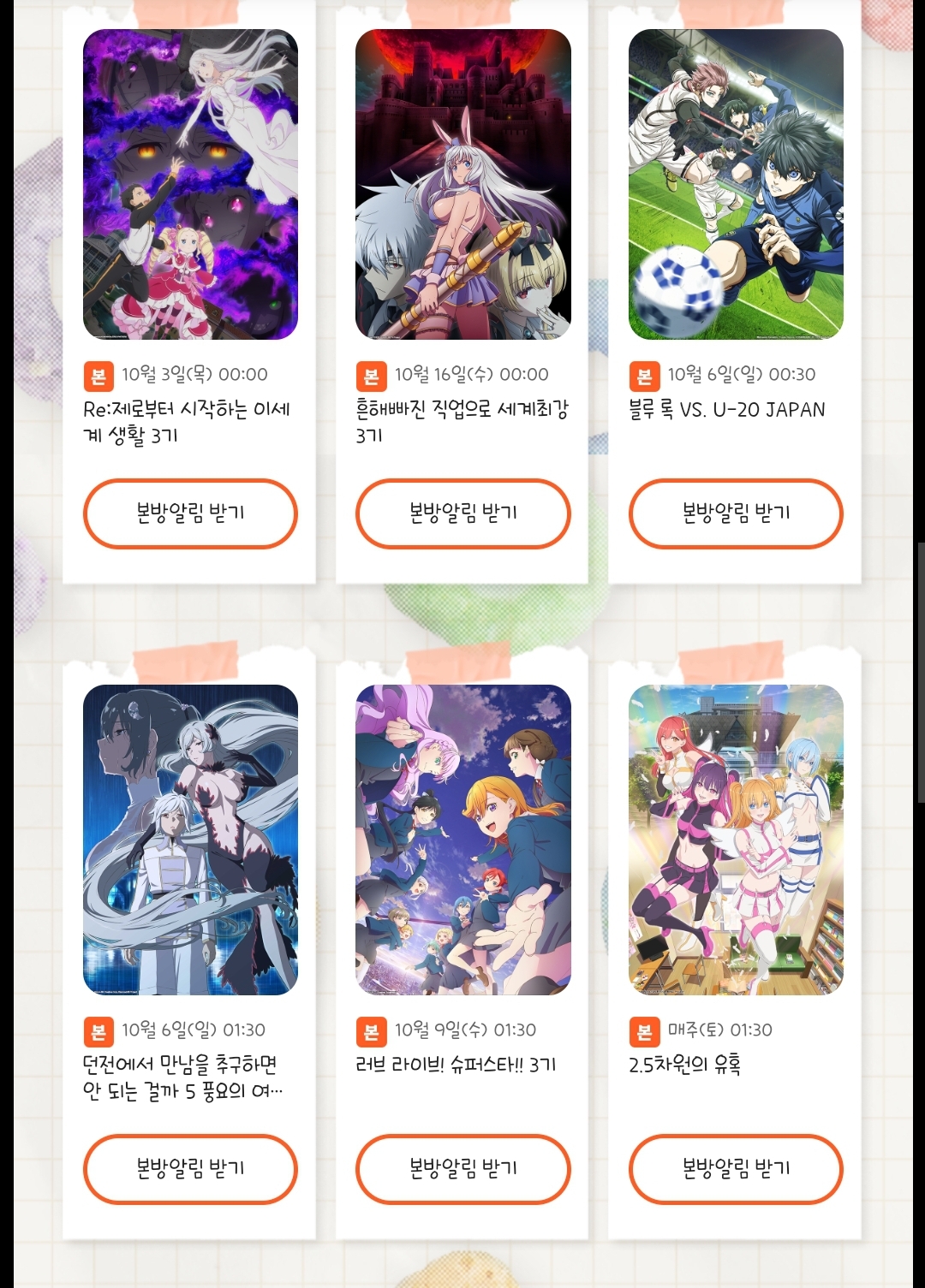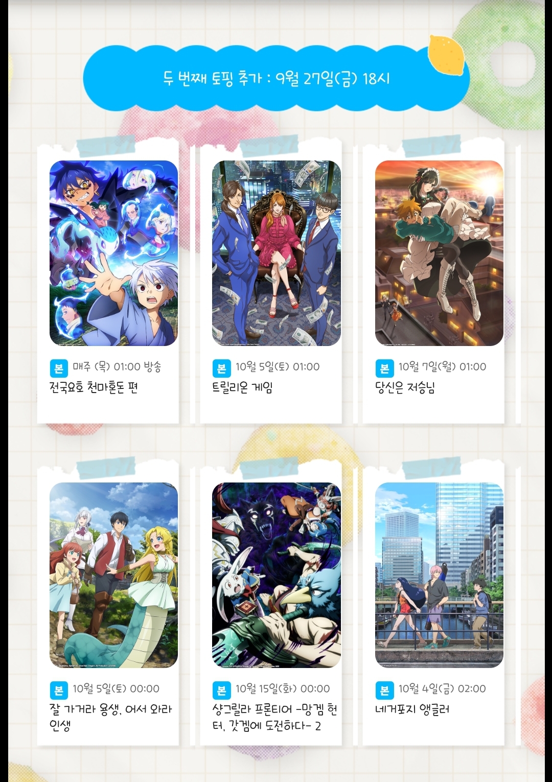 TMTonejae 2024년 4분기 애니플러스, 애니맥스 신작 2차 라인업 [애니] 작성일시 : 2024. 09. 27 (19:08) 조회 : 1,204 / 댓글 : 2 러브라이브 슈퍼스타 3기리제로 3기흔직세 3기블루록 2기던만추 5기, 방과 후 소년 하나코군 2기 등기대작들이 포함되었네요그리고 2.5차원의 유혹과 신의 탑 2기는2쿨이라 저번 분기에 이어서 방영합니다나머지는 대원과 기타 배급사,티빙 등 타 OTT를 봐야겠네요 6추천 글쓰기스크랩 신고