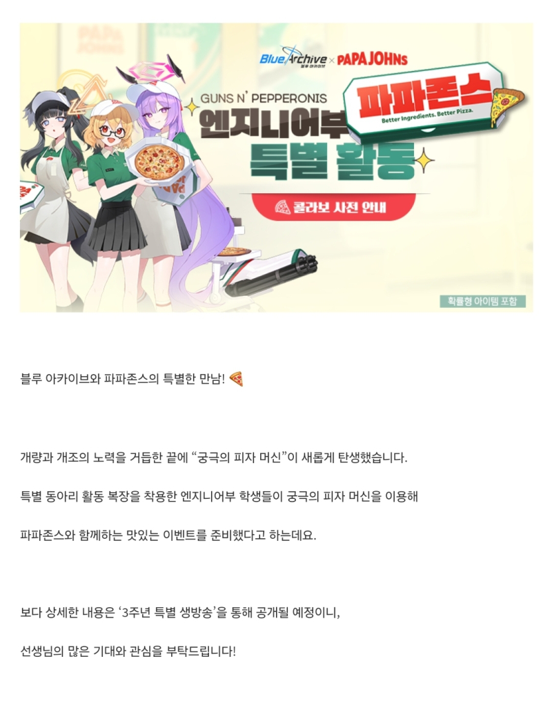 TMTonejae 이번엔 피자군요 [일반] 작성일시 : 2024. 10. 02 (17:01) 조회 : 1,423 / 댓글 : 11 뜻하지 않는 유출(?)로 인해콜라보 소식을 헐레벌떡 공개한 블아 영자면개추!!!이번엔 파파존스랑 콜라보하네요마침 동네에 있고 피자 라지 무료 쿠폰도 있어서써야겠네요자세한 내용은 추후 3주년 특별 라이브에서공개예정입니다 10추천 글쓰기스크랩 신고