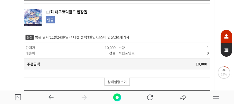 평범한송 11월 대구 코믹월드 입장권 예매완료!~ [일반] 작성일시 : 2024. 10. 15 (22:22) 조회 : 1,068 / 댓글 : 0 아시는 분들은 아시겠지만 한달 후 11월에 대구 엑스코에서 대구 코믹월드 개최 예정인데요.오늘 낮에 휴식시간 때 휴대폰을 사용해서 대구 코믹월드 입장권 예매완료를 했습니다! 4추천 글쓰기스크랩 신고