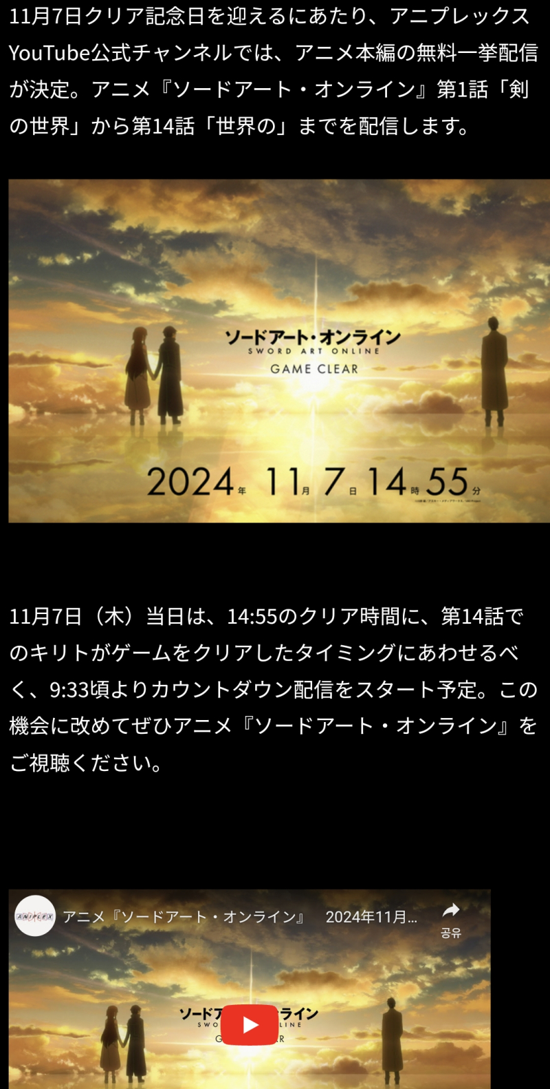 토모야 드디어 그날이 오고 말았습니다. [애니] 작성일시 : 2024. 11. 07 (00:34) 조회 : 1,875 / 댓글 : 9 정말 아무생각 없이 소아온을 정주행 하고 있었는데마침 오늘이 게임 클리어 날이였네요..(소오름)부랴 부랴 찾아보니 클리어 시간에 맞춰 9시33분부터 1화 방영을 한다고 합니다. (게임 클리어 하느라 그동안 잠수탔답니다?!) 출처(링크) : https://www.swordart-online.net/sp/news/ 10추천 글쓰기스크랩 신고