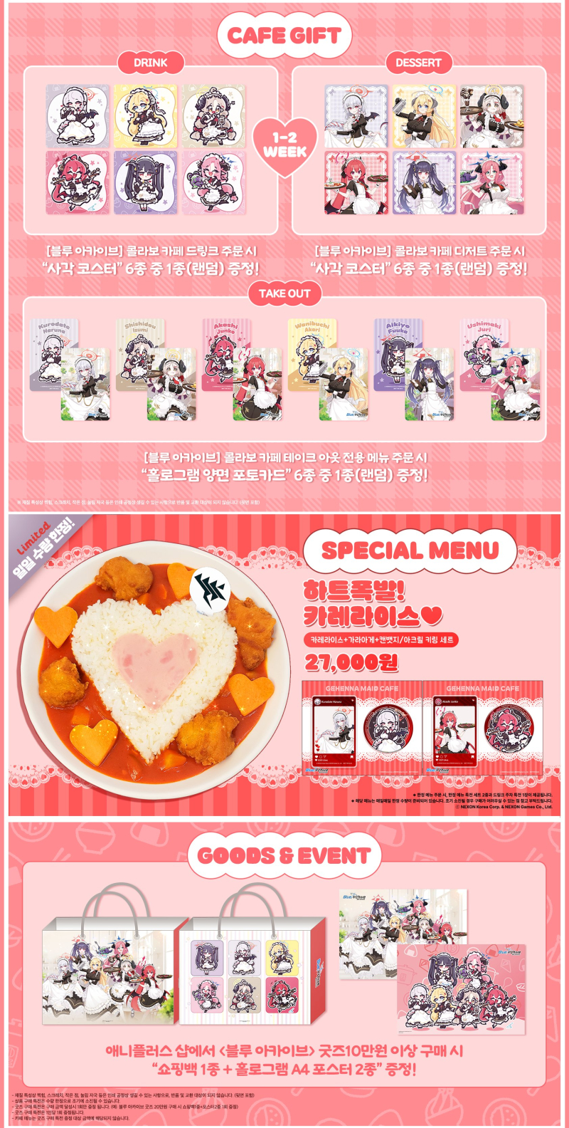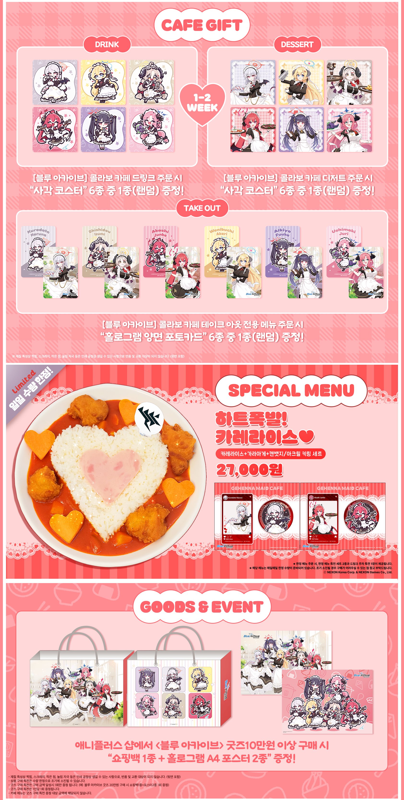 TMTonejae 이야 센세들 연말에 바쁘겠네요 [일반] 작성일시 : 2024. 11. 14 (20:42) 조회 : 1,570 / 댓글 : 13 11월 21일부터 전국 애니플러스샵에서블루아카이브 콜라보카페가 개최하네요물론 안전 등을 위해 사전예약제로진행될 예정입니다!!!곧 3주년 사운드 페스티벌과AGF2024 이벤트까지 센세들 지갑 마를 날이없겠네요 ㄷㄷ그나저나 콜캎 메뉴 중 하나인주리의 카스텔라 비주얼만 봐서는정말 위험해 보이네요 ㅋㅋㅋㅋㅋㅋㅋㅋ2년 전 스파이패밀리 콜캎에서요르씨의 치즈 케이크가 떠오르네요 ㅋㅋㅋㅋㅋ 10추천 글쓰기스크랩 신고