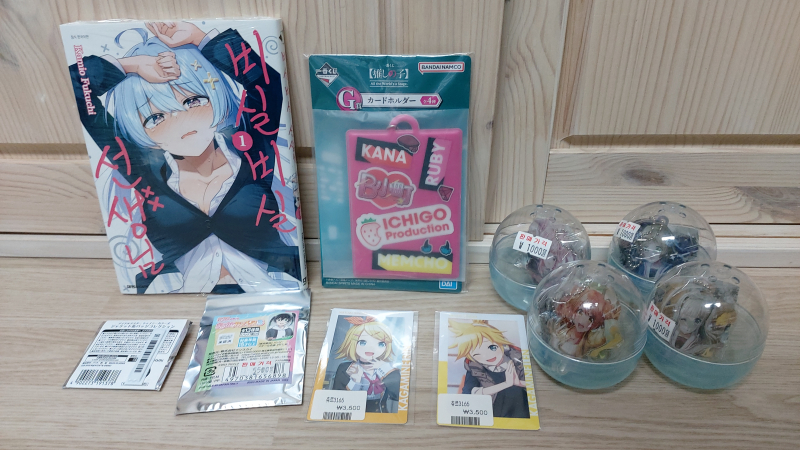 평범한송 만화책과 굿즈들 구입 및 캔뱃지 개봉 결과! [굿즈] 작성일시 : 2024. 11. 17 (16:38) 조회 : 868 / 댓글 : 4 오늘 시내에 다녀왔는데 구입한 만화책과 굿즈들 올려봅니다!먼저 구입한 만화책은 비실비실 선생님 1권이고 사진에는 없지만 3권까지 정발했더군요.만화책 다음 구입한 굿즈들은 사진처럼 보시다시피 다양핫 굿즈들을 구입했는데 그중에 캔뱃지 2개를 개봉했는데요.하나는 아이돌 마스터 샤이니 컬러즈 캔뱃지인데 사쿠라기 마노(?)가 부른 노래 제목이 적혀진 캔뱃지가 나왔고 그 다음 캔뱃지는 러브라이브 니지가사키 란쥬 캔뱃지가 나왔더군요. 5추천 글쓰기스크랩 신고