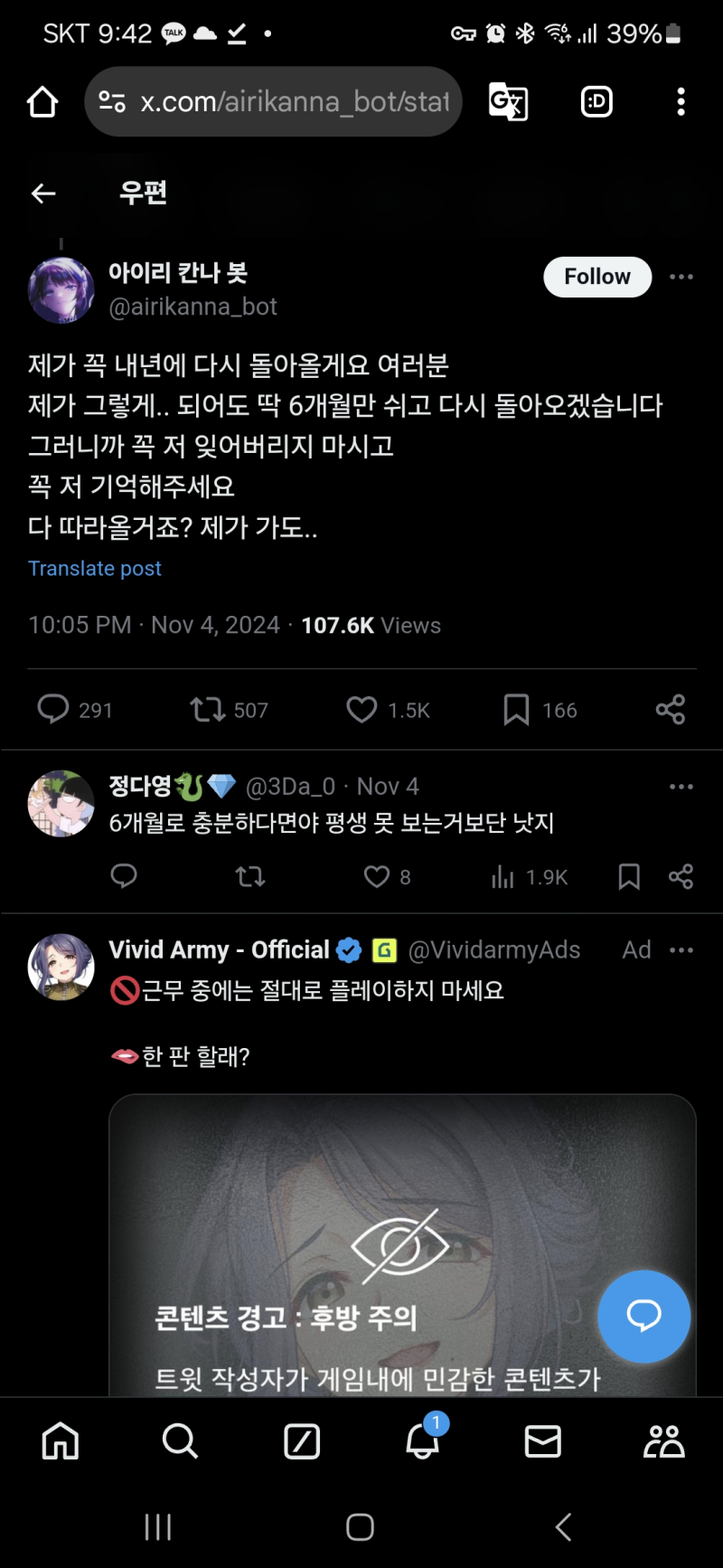 바이저 Vizer 아 술 한잔 땡기네요... [기타] 작성일시 : 2024. 12. 02 (21:53) 조회 : 938 / 댓글 : 2 6개월 뒤에 찾아가겠습니다 6추천 글쓰기스크랩 신고