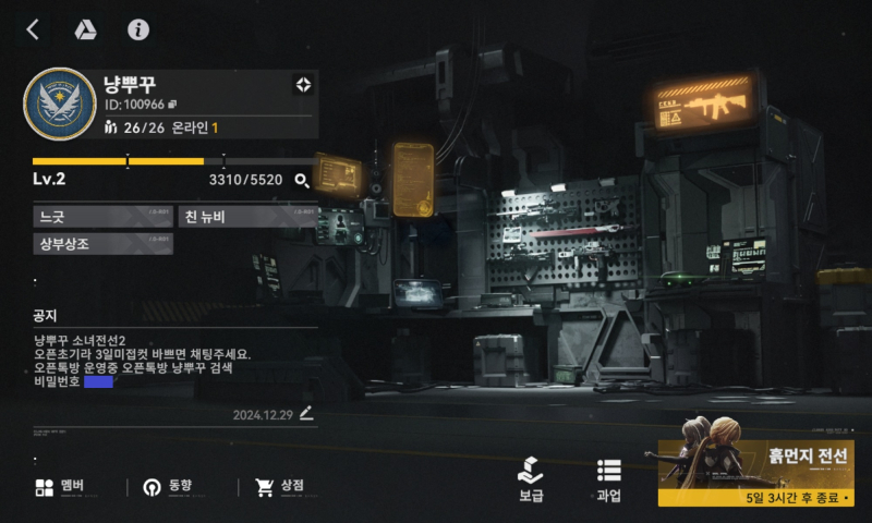 유희 [주의] 소녀전선2 서클원 모집 중 -> 모집 완료! [일반] 작성일시 : 2024. 12. 26 (09:48) 조회 : 1,008 / 댓글 : 0 ★서클장 : 다람쥐※ 저희 서클에 오시면 6성 수오미를 빌리실 수 있습니다 ㅎㅎㅎ현재 서클인원 모집이 마감되었습니다! 4추천 글쓰기스크랩 신고