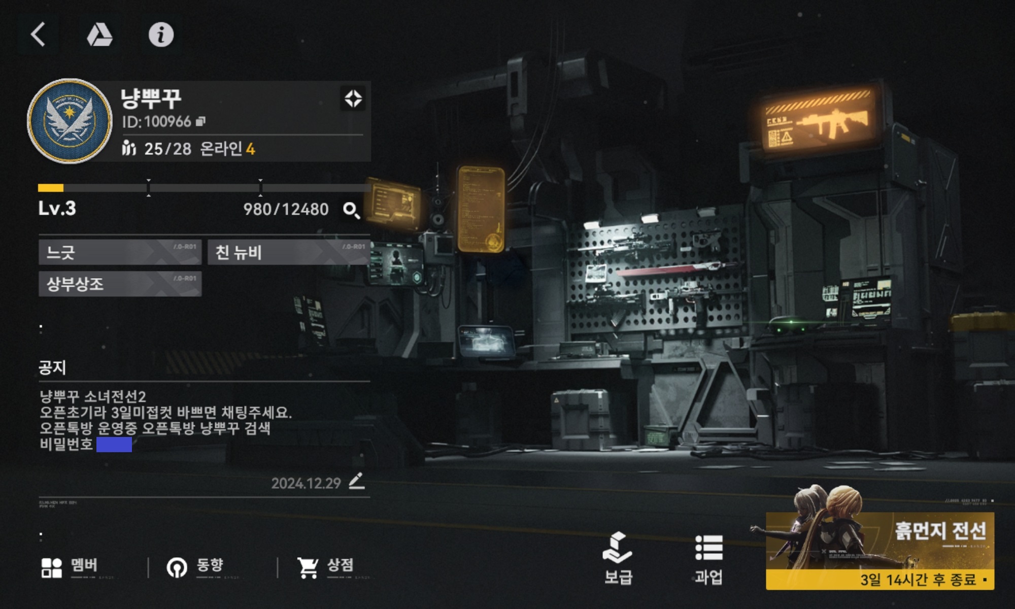유희 [주의] [소녀전선2] Lv.3 "냥뿌꾸" 서클원 모집 중(1명) [일반] 작성일시 : 2025. 01. 01 (13:19) 조회 : 903 / 댓글 : 0 Lv.3 "냥뿌꾸" ID:100966 서클원 모집 중(3명)입니다.많은 관심 부탁드립니다^^* 5추천 글쓰기스크랩 신고
