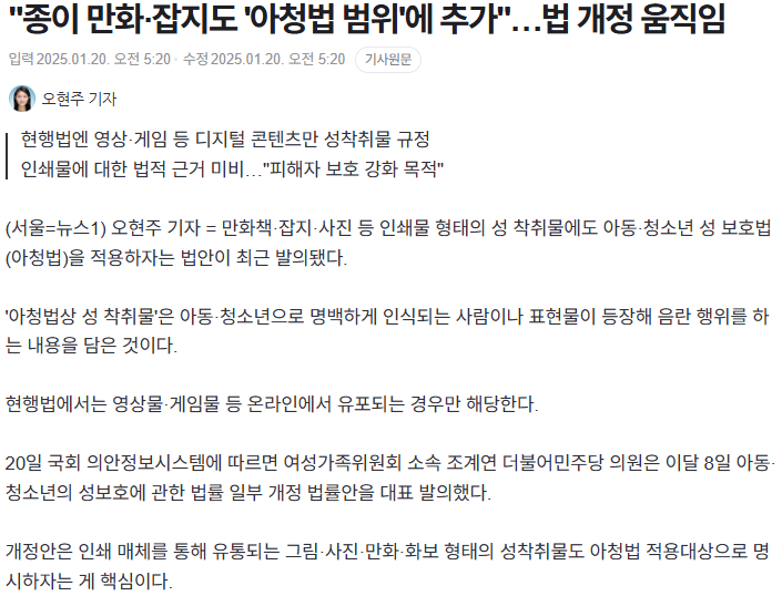 이젠 영상, 게임만이 아닌 만화(애니), 그림, 사진, 잡지도 아청법 범위에 추가되려는 움직임이 보입니다.