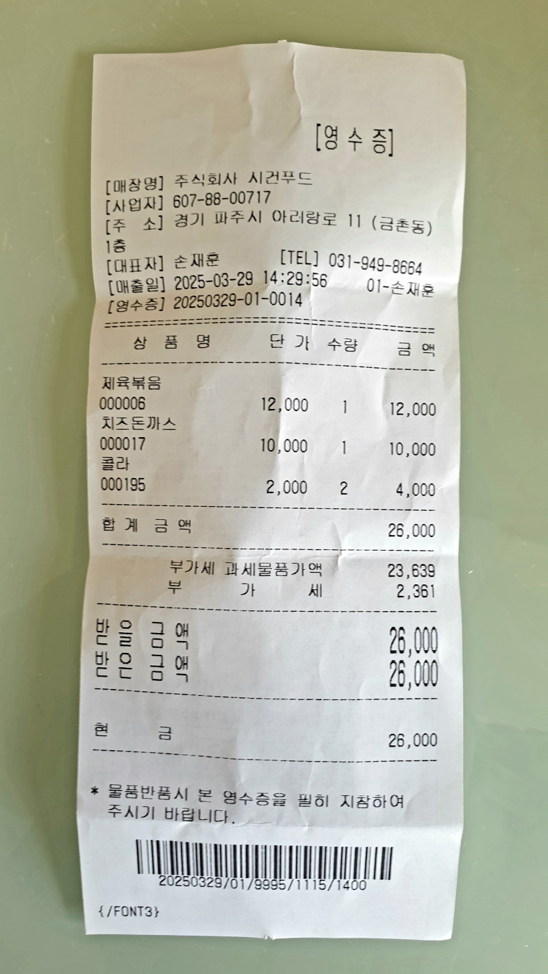 팜유재원이 3월 마지막날 토요일 점심은 금촌야식으로~ [일반] 작성일시 : 2025. 03. 29 (16:05) 조회 : 853 / 댓글 : 2 3월 마지막날 점심은 금촌야식으로~ 제육볶음 & 치즈돈까스 & 콜라, 사이다 가격은 26000원이라오~맛있게 먹었다오~^.^ 너무 배부르게 먹었다오~영수증이 콜라 2개 나오네? 나는 코카콜라 & 칠성사이다 시켰으니까~ 내년(2026년)이면 금촌야식이 20주년이라오~ 2006년부터라오~ 8추천 글쓰기스크랩 신고