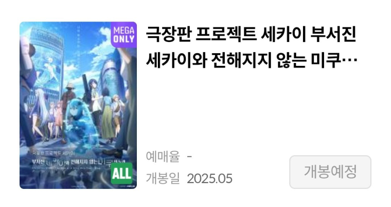 TMTonejae 극장판 프로세카 5월 메가박스 단독 개봉 [애니] 작성일시 : 2025. 04. 05 (18:39) 조회 : 989 / 댓글 : 8 메가박스 앱을 보니개봉 예정작에 있더군요오는 5월에 메가박스 단독 개봉합니다그리고 이번 달에 개봉 전 프리미어 상영회이진행될 예정입니다 6추천 글쓰기스크랩 신고
