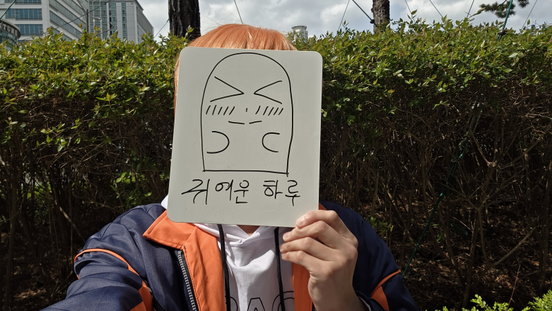 지금 다시 보니깐 코믹월드에 가서 코스프레 상태로 코스프레 인증샷 찍을 때 저 사진들처럼 화이트보드에 얼굴 표정 그리거나 제 귀여운 마스코트(?) 캐릭터 그려서 코스프레 인증샷 찍는 거 괜찮네요!