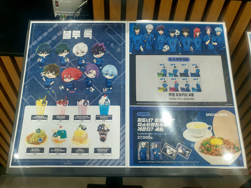 팜유재원이 축구는 살인이다! 애니플러스 서울 합정점에 가서 블루 록 콜라보카페 3 ~ 4주차로 다녀왔다오~ [일반] 작성일시 : 2025. 04. 20 (19:45) 조회 : 1,112 / 댓글 : 4 서울 마포구 합정동에 봄에 따뜻하구나~ 오랜만에 애니플러스 서울합정점에 다녀왔다오~ 그리고 카토 메구미 피규어도 잠깐 둘러 보았다오~ 축구는 살인이다! 블루 록 굿즈를 둘러보고~ 블루 록 콜라보카페 둘러보았구나~나는 레오의 블루베리 요거트 스무디 & 히오리의 블루 레몬 소다로 시켰다오~가격은 6500원 + 6500원는 13000원이라오~맛있게 먹고~블루 록 3 ~ 4주차 특전은 바로 투명 포토카드 8종인데 2종 받았다오~ 부럽지?즐거운 애니플러스 블루 록 콜라보카페였다오~ 11추천 글쓰기스크랩 신고