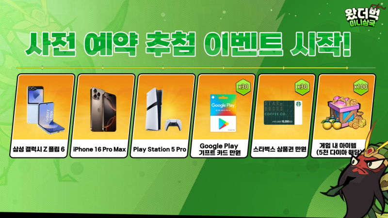 치토스 왔더벅 미니삼국 6.4 출시합니다. [일반] 작성일시 : 2025. 05. 30 (16:14) 조회 : 720 / 댓글 : 1 왔더벅 미니삼국이거 6월 4일 출시예정이거든요사전예약 해두면 3천뽑 + 오호대장군 마초를 받을 수 있고추첨해서 삼성 갤Z플립6 아이폰 16 프맥, 플스 5pro 구글 기프트카드 스벅 상품권 인게임 아이템 추첨으로 받을 수 있습니다. 6.4일까지 이제 일주일도 안남았거든요경품도 노려보고 사전예약 보상으로 뽑기랑 마초 주니까게임 해볼거면 사전예약은 해두시는거 추천 6추천 글쓰기스크랩 신고