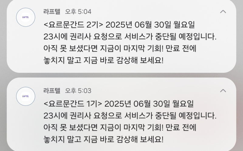 쇼케라 라프텔 애니메이션 판권 종료 예정 [애니] 작성일시 : 2025. 06. 18 (17:11) 조회 : 612 / 댓글 : 1 요르문간드 시리즈 판권 종료 됩니다 5추천 글쓰기스크랩 신고