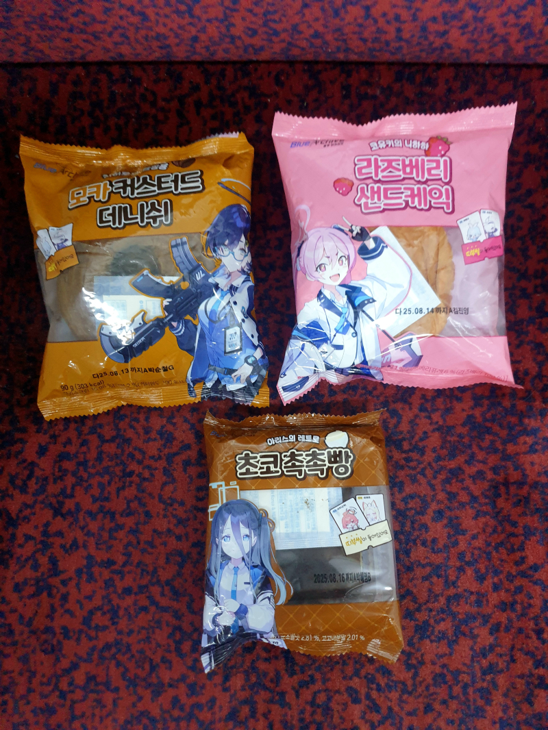 블루 아카이브 모카데니쉬~ 라즈베리 샌드케익~ 초코촉촉빵으로 사 맛있게 먹었다오~^.^