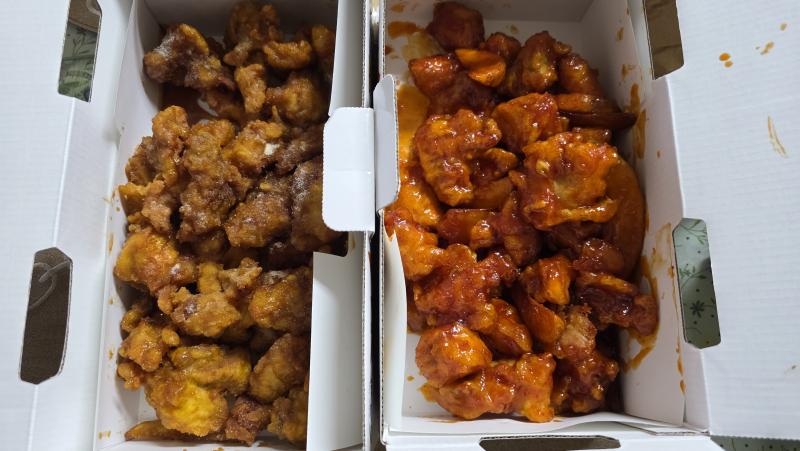 평범한송 점심은 순살치킨 2마리 [일반] 작성일시 : 2025. 08. 15 (13:04) 조회 : 836 / 댓글 : 11 얼마 전에 제가 동생에게 치킨 기프트콘을 선물로 받았는데요.오늘 점심을 치킨을 먹을까 생각했는데 동생에게 선물로 받은 치킨 기프트콘이 생각나길래 치킨집에 가서 순살치킨 2마리 사왔습니다.60계 치킨이고 왼쪽은 간지 순살치킨이고 오른쪽은 양념 순살치킨인데 개인취향이겠지만 확실히 순살치킨이 맛있네요. 8추천 글쓰기스크랩 신고