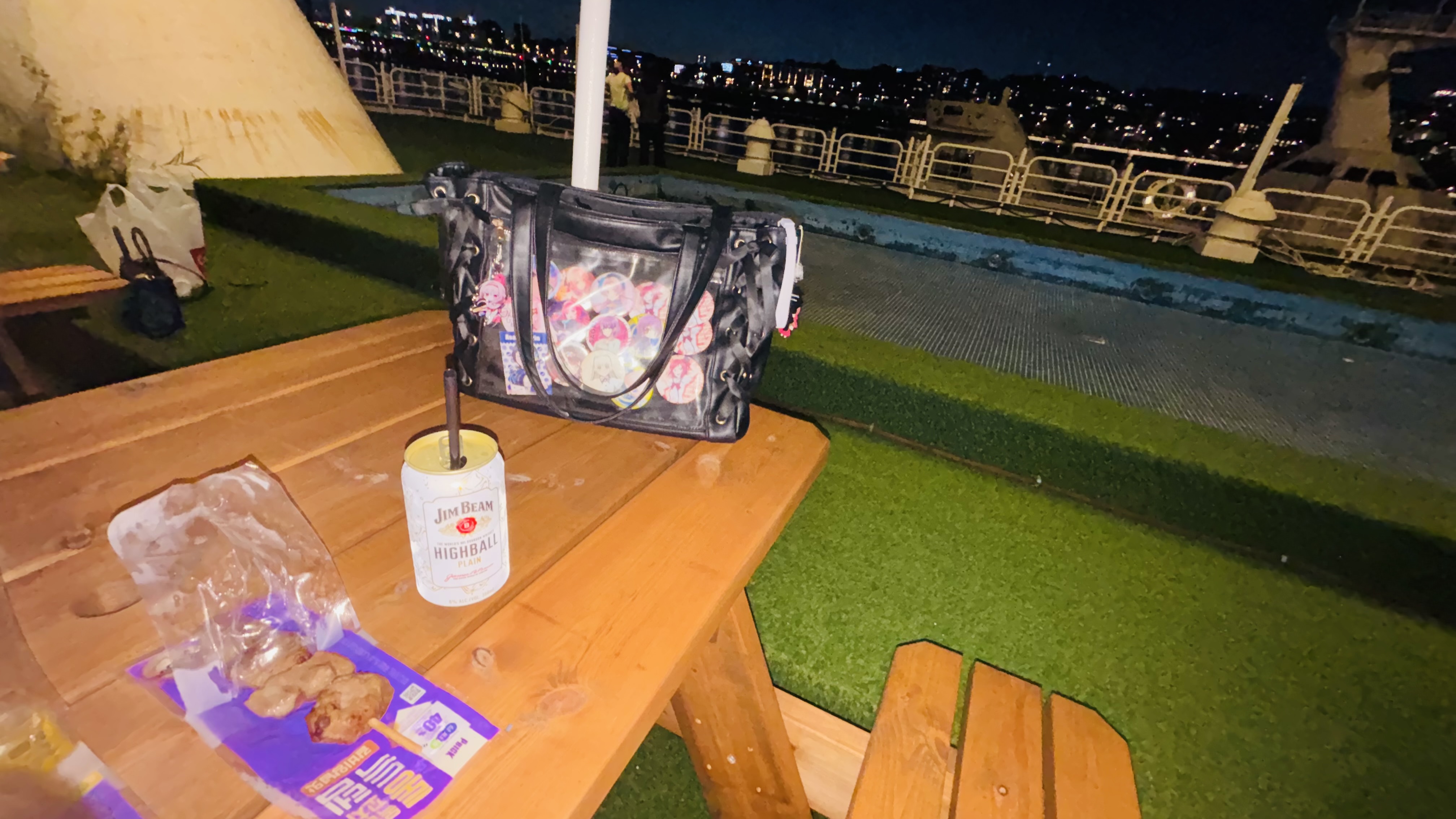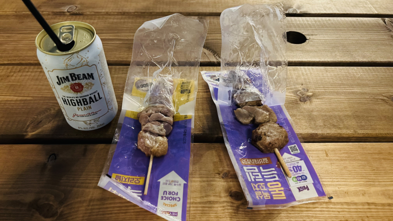 저는 맥주랑 라면 대신 짐빔 하이볼 플레인과 닭꼬치 2개 샀습니다