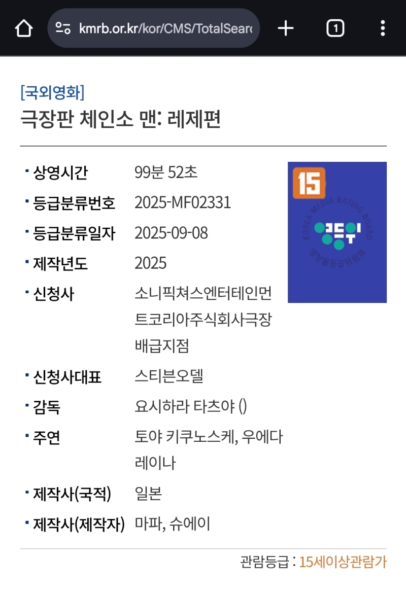 TMTonejae 체인소맨 레제편 국내 관람 등급 공개 [애니] 작성일시 : 2025. 09. 09 (14:05) 조회 : 1,226 / 댓글 : 6 TVA는 청불, 극장판은 15세로 한귀멸의 칼날처럼체인소맨도 15세 등급으로 확정되었습니다선정적인 장면과 액션씬에서 수위가 세서청불도 생각했는데 다행히 너무 자세히 묘사하지않고 잠깐잠깐 나오는 정도로 영등위가판단한 것으로 보입니다이로써 학생들은 중간고사 끝난 후혹은 다음 달 추석 황금연휴 때 볼 수 있을 것 같네요참고로 러닝타임은 99분입니다사실상 거의 1시간 40분이기 때문에1시간 40분 정도라고 생각하시면 됩니다 ㅎㅎ 5추천 글쓰기스크랩 신고