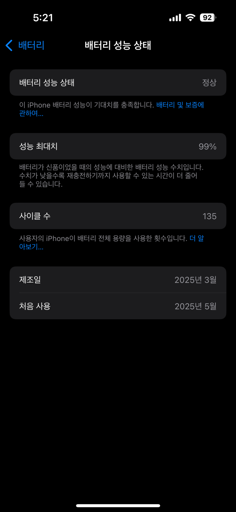 보라마키 4개월동안 성능 100%였던 배터리 [일반] 작성일시 : 2025. 09. 27 (17:27) 조회 : 471 / 댓글 : 2 올해 5월 처음 산 아이폰 15무려 4개월동안이나 배터리 성능 100%를 유지하고 있었군요?참고로 사이클 135번 돌았습니다iOS 26 업뎃은 안했는데우마무스메 게임에서 26으로 업데이트하면 게임이 비정상적으로 꺼진다고 해서 안하고 있습니다뭐 어차피 아이폰 15는 램도 6기가이고 애플 인텔리전스 지원 안해서 안하는게 낫지만요 3추천 글쓰기스크랩 신고