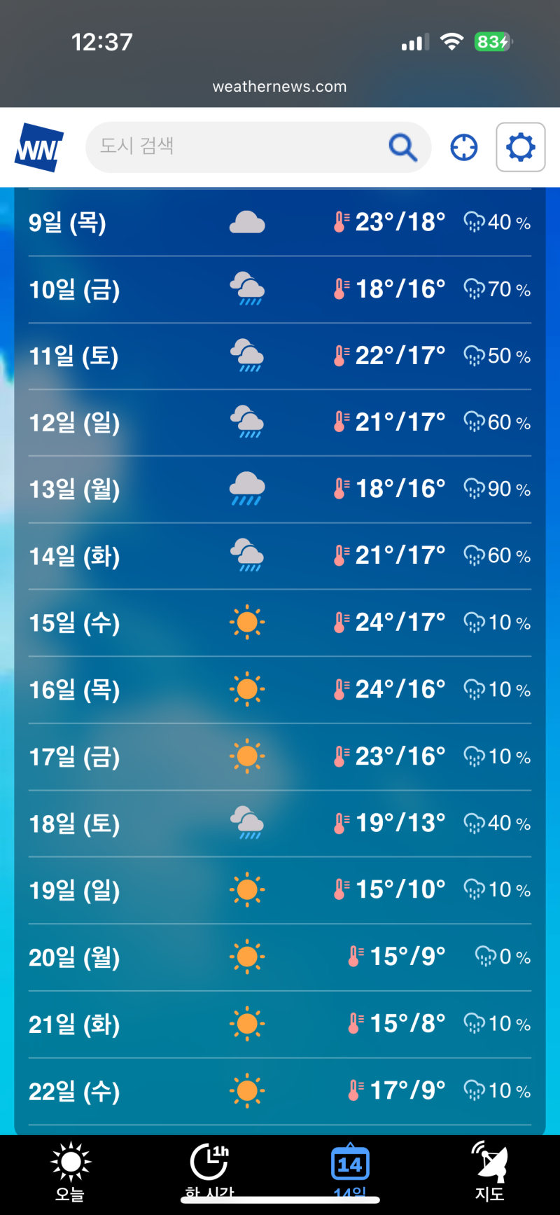 보라마키 슬슬 겨울이군요 [일반] 작성일시 : 2025. 10. 08 (12:42) 조회 : 543 / 댓글 : 11 9월 중반까지만 했어도 더웠는데, 이번달 후반부터 기온이 이렇게 내려간다네요...아직 단풍도 못 봤는데 올해는 10월 말에 눈이 올지도 모르겠습니다. 6추천 글쓰기스크랩 신고