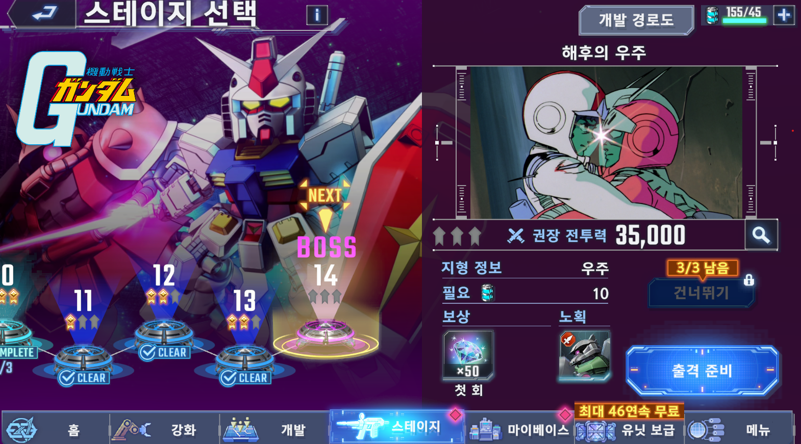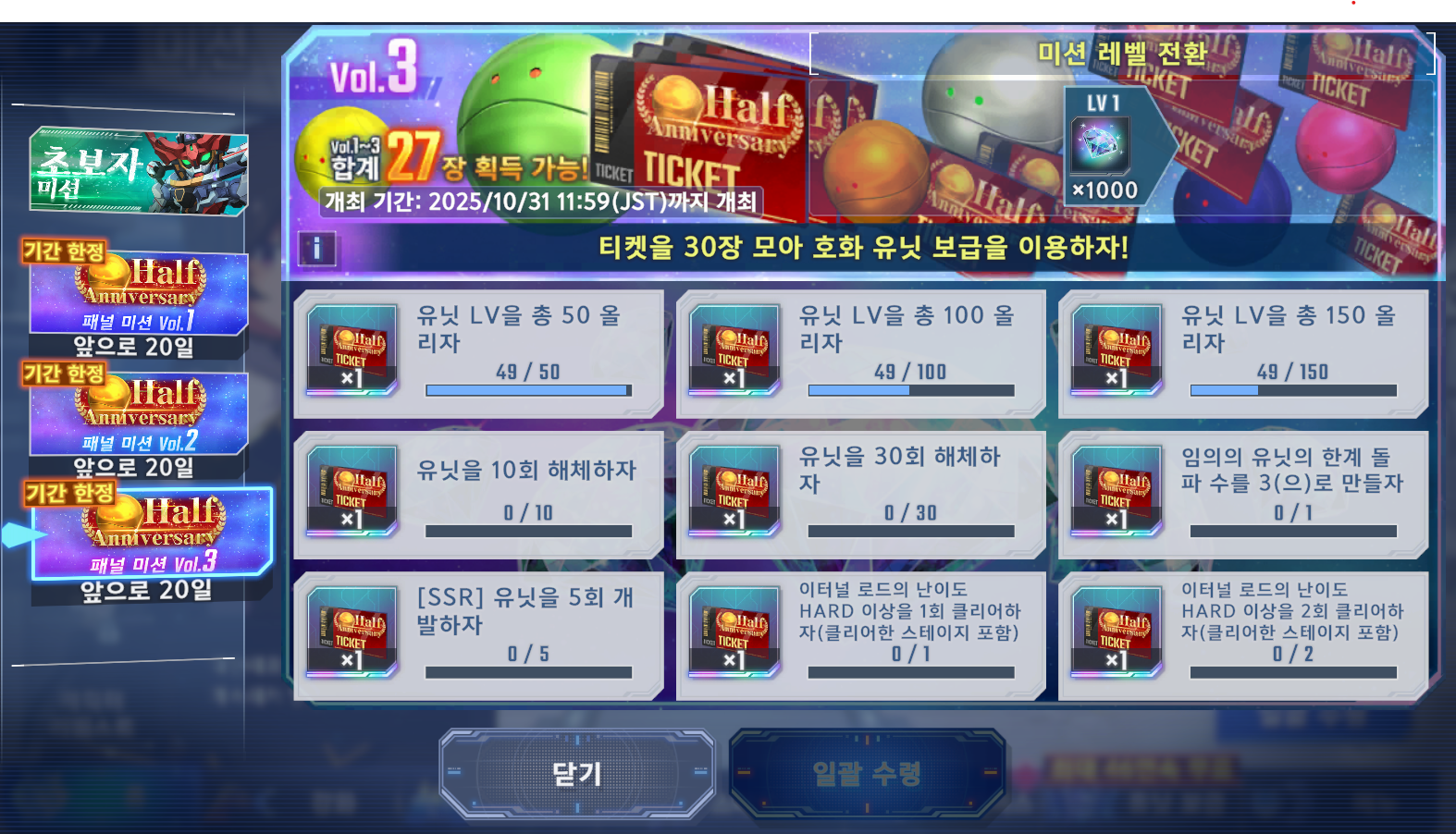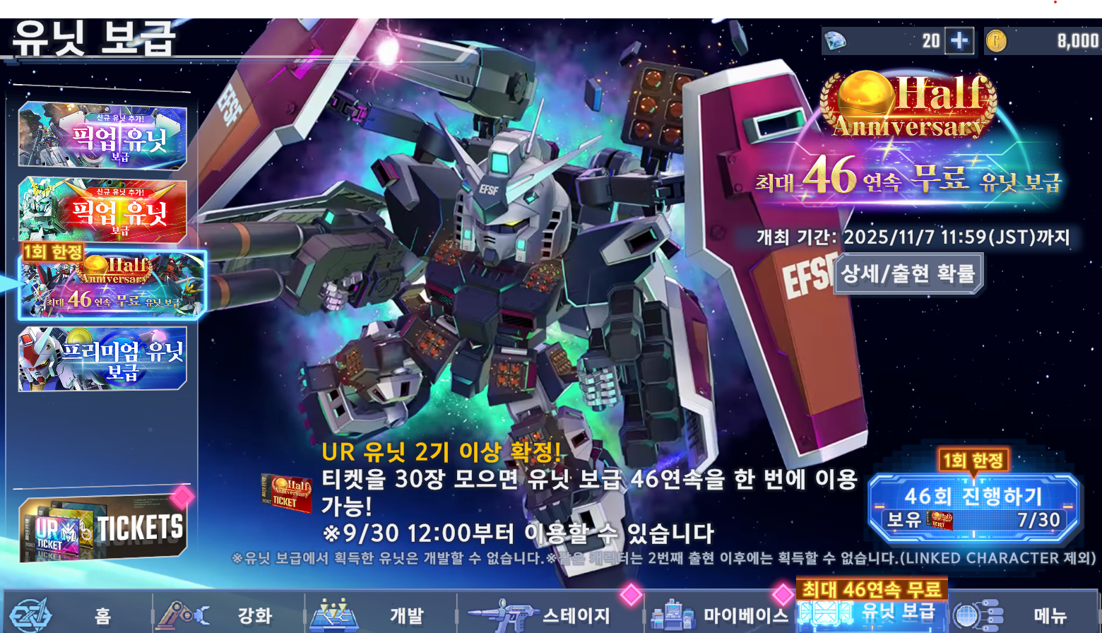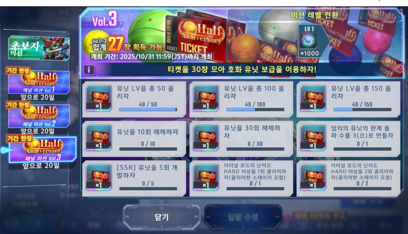 flw SD건담 얼른 티켓 모아야 하는데 [기타] 작성일시 : 2025. 10. 10 (16:02) 조회 : 522 / 댓글 : 2 SD건담겜 초창기 때 했었는데이번에 반주년이 되었다고 해서한번 복귀해 보았어요일단 스테이지 좀 더 진도 나가보고 있는데오랜만에 하니 재밌긴 하군요지금 이벤트도 진행하는 중인데패널 미션에 있는 티켓들을 모으면46연속 보급을 해볼 수 있더라구요UR2기를 확정으로 준대서기간 끝나기 전에 돌려 볼 생각이에요 5추천 글쓰기스크랩 신고