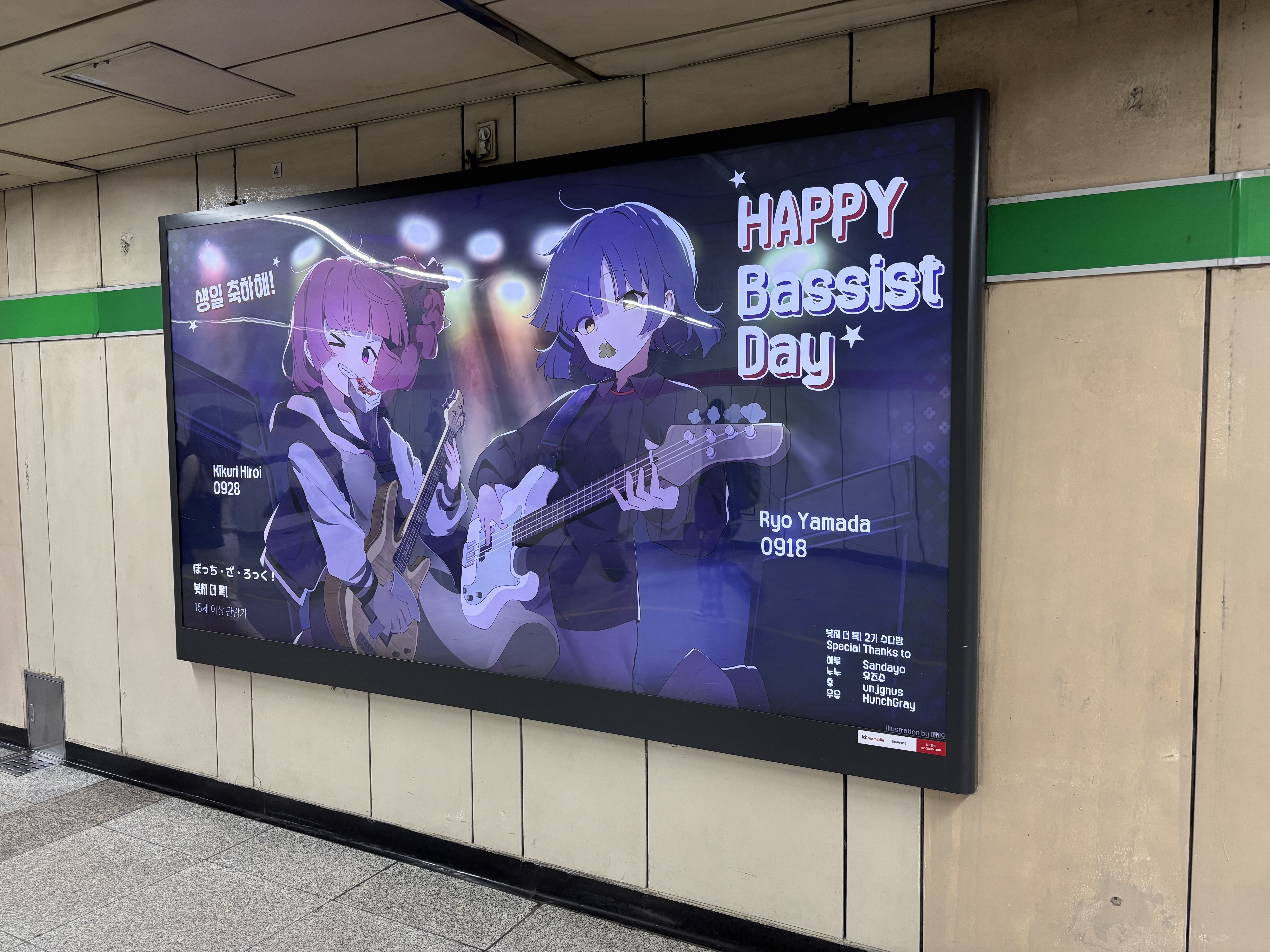 보라마키 잠실역 봇치 더 록 전광판 봤습니다!! [일반] 작성일시 : 2025. 10. 22 (19:29) 조회 : 446 / 댓글 : 4 야마다 료, 히로이 키쿠리 생일 전광판인데각각 9월 18일, 9월 28일으로 10일 차이라 같이 축하한 것 같네요같이 홍보한 봇치더록 2기 수다방도 많은 관심 부탁드립니다!! 4추천 글쓰기스크랩 신고