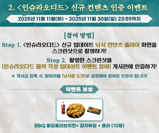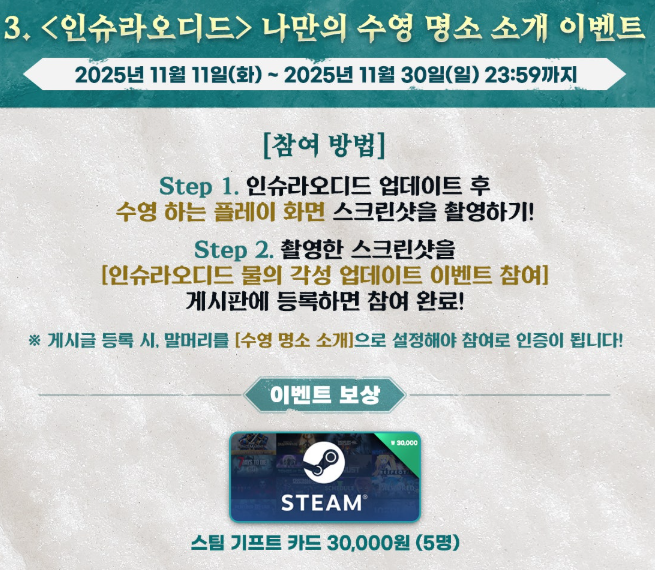 flw 인슈라오디드 인증샷 찍어놔야겠다 [일반] 작성일시 : 2025. 11. 18 (15:53) 조회 : 420 / 댓글 : 1 인슈라오디드 이번에 물 생겨난 김에배수구 2종 먼저 제작해봤는데 곧 수로 같은 것도 함 만들어 볼 생각이에요저는 일찌감치 구입해놨지만 지금 스팀에서 할인도 하고 있더라구요스팀 메인 카페에서 이벤트도 하던데낚시하는 장면이나 수영 명소를 공유 시소정의 보상을 준다고 하는군요혹시나 모를 당첨을 위해 인증샷이나 한번 남겨봐야겠어요 3추천 글쓰기스크랩 신고