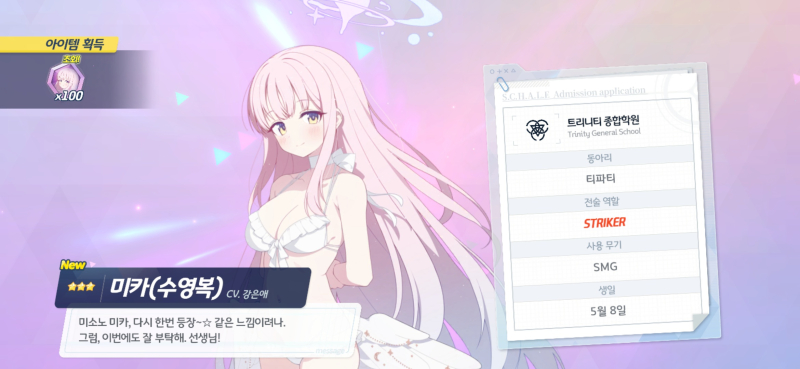 타카기 [주의] [블루 아카이브] 미카(수영복) & 나기사(수영복) 획득! [일반] 작성일시 : 2025. 12. 23 (13:53) 조회 : 344 / 댓글 : 5 미카(수영복)은 50회 모집만에 얻었고, 나기사(수영복)은 60회 모집만에 얻었습니다. 드디어, 꿈에 그리던 미카(수영복)을 얻었네요.ㅎㅎ 세이아(수영복), 하스미(수영복)은 100회 무료 모집 했는데도, 결국 못얻었고,히나(드레스)는 청휘석 부족으로, 아직 못얻어서 아쉽지만,그래도, 미카(수영복) 못얻는 것보단 낫습니다. 아무튼, 미카(수영복)얻어서, 기분 좋습니다.ㅎㅎ 6추천 글쓰기스크랩 신고