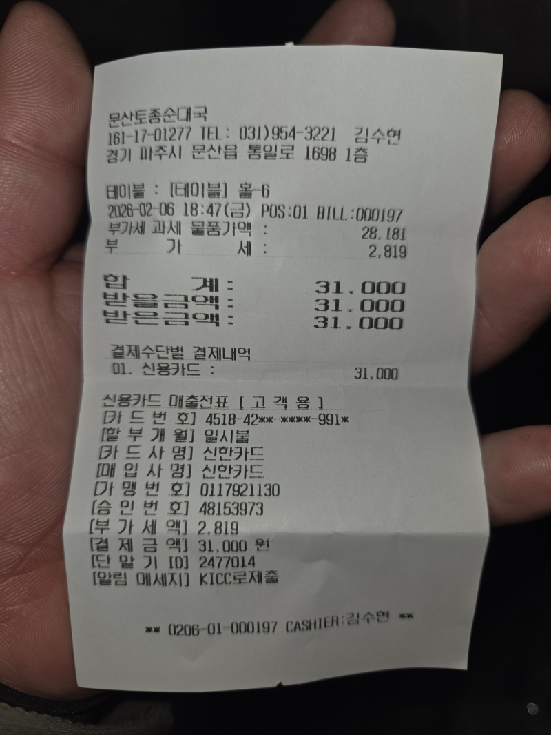 팜유재원이 추운데 금요일 저녁 빠더님하고 같이 문산순대국으로 먹으러 다녀왔다오~ [일반] 작성일시 : 2026. 02. 06 (20:30) 조회 : 337 / 댓글 : 0 오랜만에 경기 파주시 문산읍에 다녀왔다오~ 한 바퀴 돌고~ PC방에 가서 일본 애니메이션 커뮤니티도 보았다오~ 금요일 저녁이다오~ 빠더님 만났다오~ 빠더님하고 같이~ 문산순대국으로 먹으러 왔다오~ 순대국정식 맛있게 사 먹었다오~ 문산 한 바퀴 도는데 야경이 보인다! 보여~반짝반짝 빛나네~ 8추천 글쓰기스크랩 신고