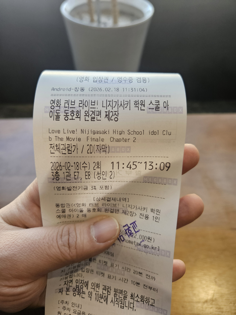TMTonejae 러브라이브 니지동 완결편 2장 보러 갔습니다 [애니] 작성일시 : 2026. 02. 18 (13:15) 조회 : 346 / 댓글 : 13 연휴 마지막 날집에서 가까운 창동 메박에서니지동 완결편 2장 보러 왔습니다애니플러스에서 진행한 이벤트에 당첨되어서받은 예매권으로 잘 봤습니다라이브도 스토리도 만족하고마지막 최종장도 기대됩니다특전은 카스밍과 리나리 얻었네요시오리코나 리나리 원했는데딱 나와서 좋네요 ㅎㅎ 8추천 글쓰기스크랩 신고